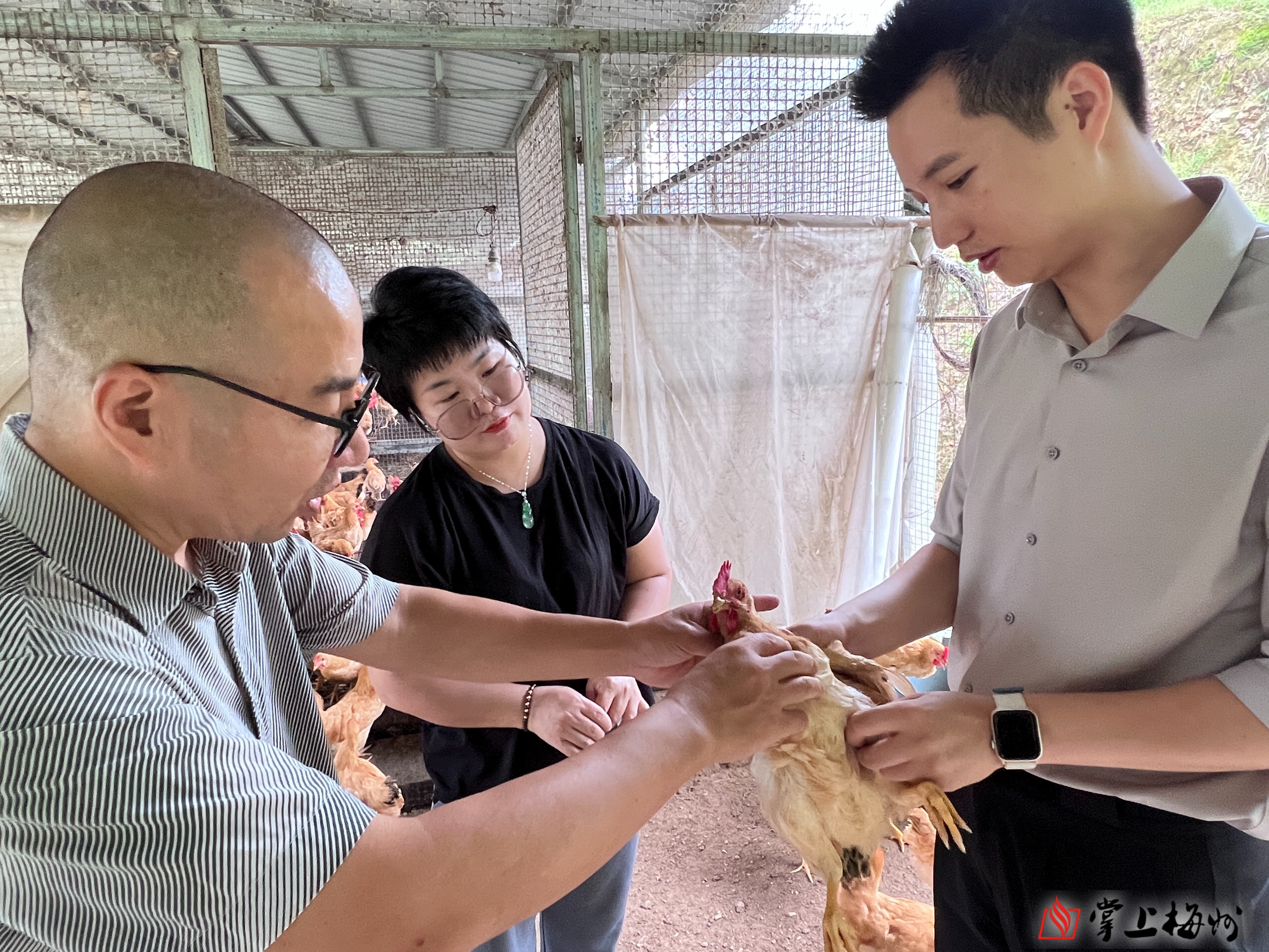 姚婉清团队走进鸡舍,与农户一同查看“山苍子无抗鸡”的生长情况。