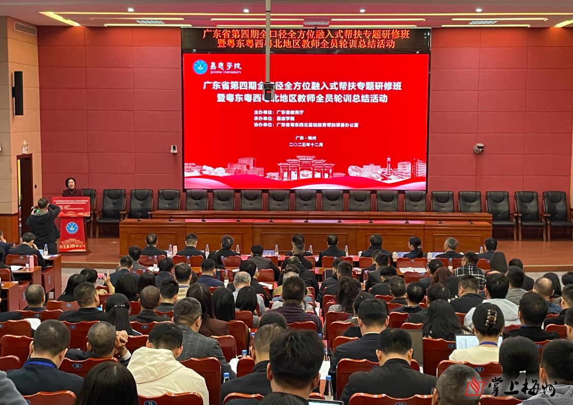 掌上梅州讯 12月8日,广东省第四期全口径全方位融入式帮扶专题研修班暨粤东粤西粤北地区教师全员轮训总结活动在嘉应学院隆重启动。此次活动以“‘两全一融’促均衡,‘全员轮训’强根基”为主题,深入贯彻《广东省推动基础教育高质量发展行动方案》,系统总结教育帮扶与轮训成效,部署下一阶段重点任务。全省21个地市教育局、高校及项目单位300余名负责人齐聚梅州,共绘教育优质均衡发展新蓝图。省委教育工委委员、省教育厅党组成员、副厅长李璧亮、嘉应学院党委书记陈文海等出席活动。