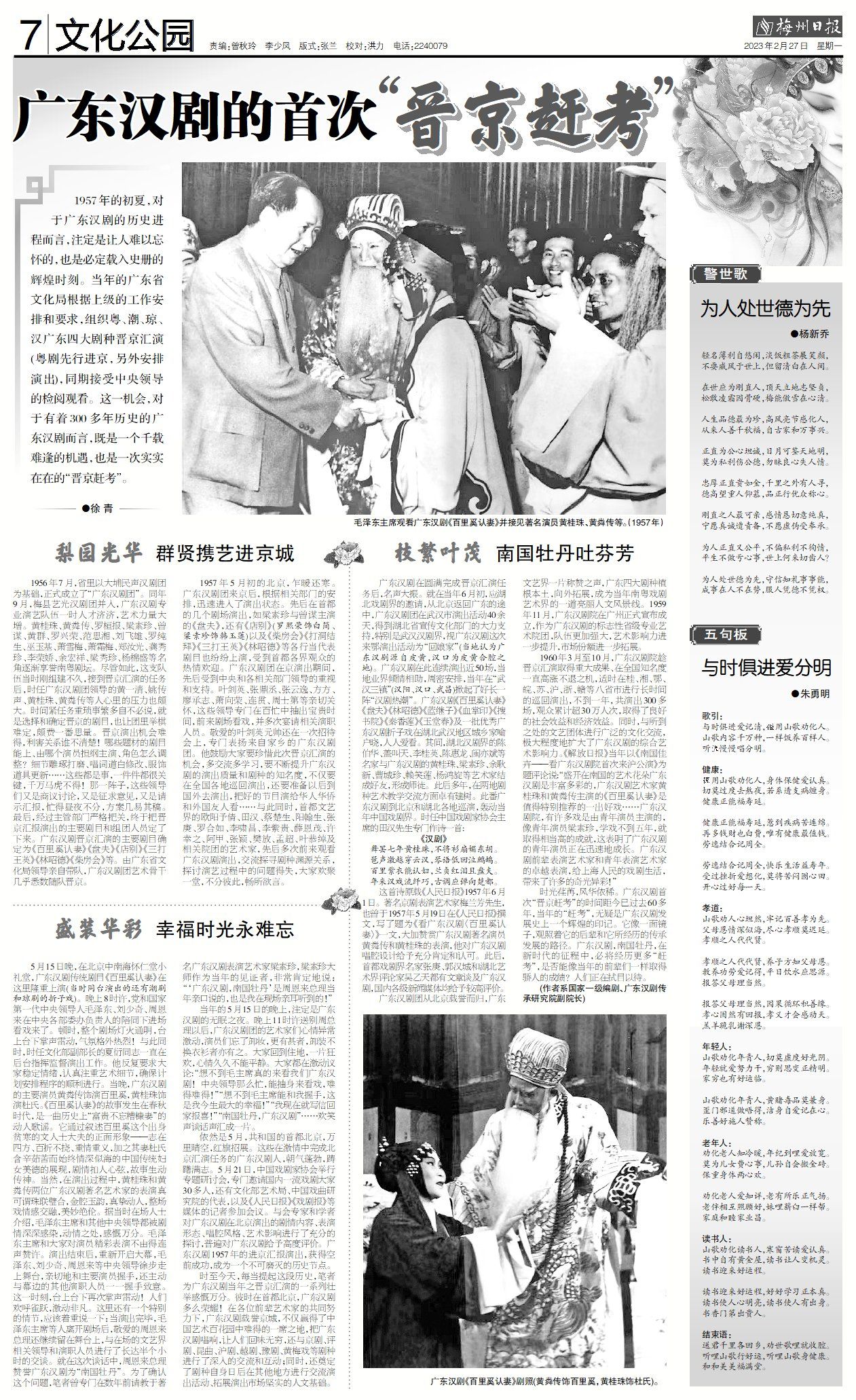 5月15日晚,在北京中南海怀仁堂小礼堂,广东汉剧传统剧目《百里奚认妻》在这里隆重上演(当时同台演出的还有潮剧和琼剧的折子戏)。晚上8时许,党和国家第一代中央领导人毛泽东、刘少奇、周恩来在中央各部委办负责人的陪同下进场看戏来了。顿时,整个剧场灯火通明,台上台下掌声雷动,气氛格外热烈!与此同时,时任文化部副部长的夏衍同志一直在后台指挥监督演出工作。他反复要求大家稳定情绪,认真注重艺术细节,确保计划安排程序的顺利进行。当晚,广东汉剧的主要演员黄粦传饰演百里奚,黄桂珠饰演杜氏。《百里奚认妻》的故事发生在春秋时代,是一曲历史上“富贵不忘糟糠妻”的动人歌谣。它通过叙述百里奚这个出身贫寒的文人士大夫的正面形象——志在四方、百折不挠、重情重义,加之其妻杜氏含辛茹苦而始终情深似海的中国传统妇女美德的展现,剧情扣人心弦,故事生动传神。当然,在演出过程中,黄桂珠和黄粦传两位广东汉剧著名艺术家的表演真可谓珠联璧合,金腔玉韵,真挚动人,整场戏情感交融,美妙绝伦。据当时在场人士介绍,毛泽东主席和其他中央领导都被剧情深深感染,动情之处,感慨万分。毛泽东主席和大家对演员精彩表演不由得连声赞许。演出结束后,重新开启大幕,毛泽东、刘少奇、周恩来等中央领导徐步走上舞台,亲切地和主要演员握手,还主动与幕边的其他演职人员一一握手致意。这一时刻,台上台下再次掌声雷动!人们欢呼雀跃,激动非凡。这里还有一个特别的情节,应该着重说一下:当演出完毕,毛泽东主席等人离开剧场后,敬爱的周恩来总理还继续留在舞台上,与在场的文艺界相关领导和演职人员进行了长达半个小时的交谈。就在这次谈话中,周恩来总理赞誉广东汉剧为“南国牡丹”。为了确认这个问题,笔者曾专门在数年前请教于著名广东汉剧表演艺术家梁素珍,梁素珍大师作为当年的见证者,非常肯定地说:“‘广东汉剧,南国牡丹’是周恩来总理当年亲口说的,也是我在现场亲耳听到的!”