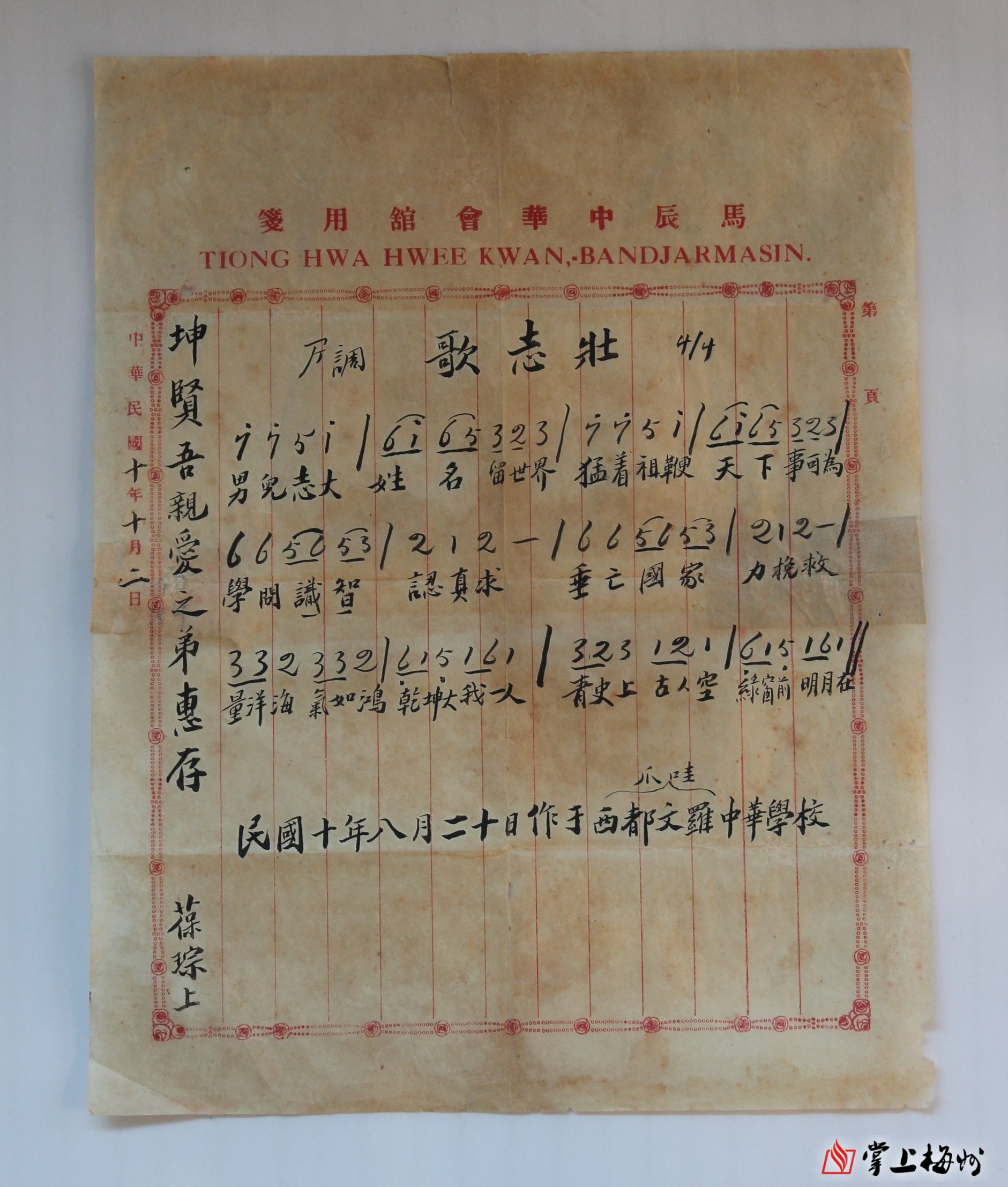 阳历九月十九日接读由泗转寄来一函,备聆种切。兄于八月间在西都文罗埠中华学校代课期满,即于八月廿六日乘车往泗,该晚即乘轮应婆罗洲马辰中华学校之聘(阅世界地图即知),于廿九日抵。校中同事只梁益三先生一人亦系梅县人,学生不过四十余人。盖华侨虽有数千,大半皆入荷兰学校读书也(荷校华生三百余人)。此埠较大,衣、食、处三者亦较为安适。校舍前临大河,傍晚凭栏,观小孩泅水,或倚篱玩花,颇可乐也。惟兄南来两载,虽四易枝栖而未赋闲一月,舟车劳苦已损失精神不少。而此次新任辰校,应酬如麻,又筹备圣诞,校务尤繁,一月来不惟握管无暇,精液大受损伤,因致头昏腰骨痛。旬日来之光阴,大半消磨于茶鼎药炉之内,近日尚未全(痊)愈也,也只得慢慢调养而已。