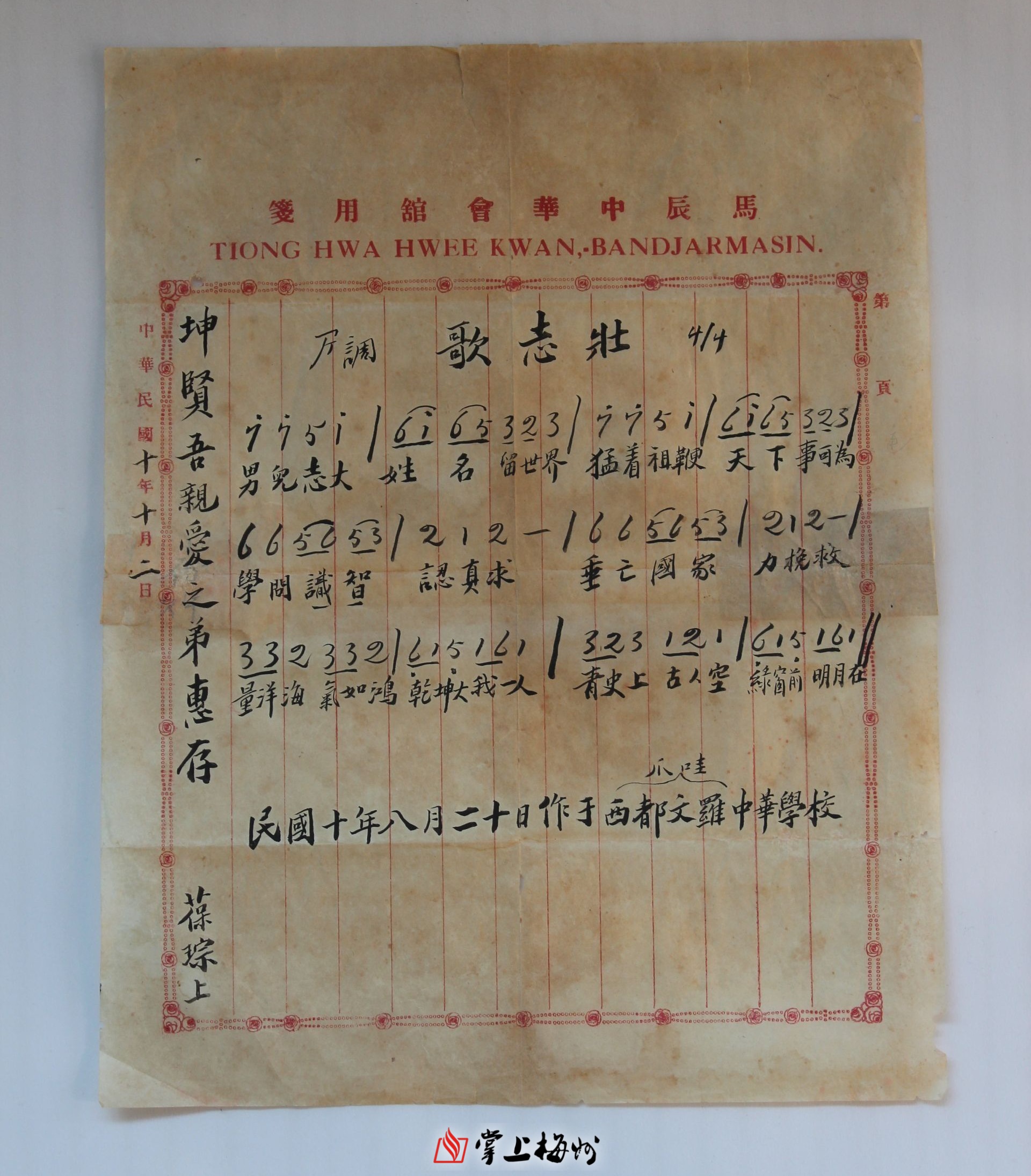 阳历九月十九日接读由泗转寄来一函,备聆种切。兄于八月间在西都文罗埠中华学校代课期满,即于八月廿六日乘车往泗,该晚即乘轮应婆罗洲马辰中华学校之聘(阅世界地图即知),于廿九日抵。校中同事只梁益三先生一人亦系梅县人,学生不过四十余人。盖华侨虽有数千,大半皆入荷兰学校读书也(荷校华生三百余人)。此埠较大,衣、食、处三者亦较为安适。校舍前临大河,傍晚凭栏,观小孩泅水,或倚篱玩花,颇可乐也。惟兄南来两载,虽四易枝栖而未赋闲一月,舟车劳苦已损失精神不少。而此次新任辰校,应酬如麻,又筹备圣诞,校务尤繁,一月来不惟握管无暇,精神大受损伤,因致头昏腰骨痛。旬日来之光阴,大半消磨于茶鼎药炉之内,近日尚未全(痊)愈也,也只得慢慢调养而已。