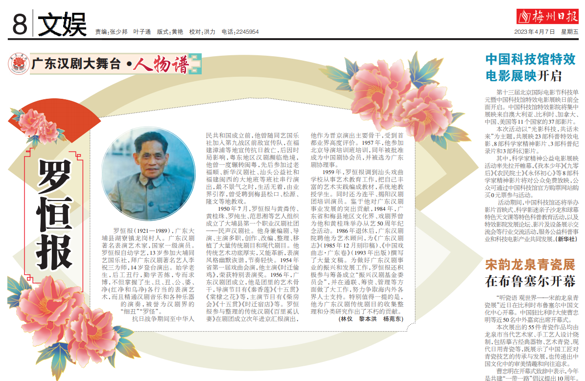 罗恒报(1921—1989),广东大埔县湖寮镇龙岗村人。广东汉剧著名表演艺术家,国家一级演员。罗恒报自幼学艺,13岁参加大埔同艺国乐社,拜广东汉剧著名艺人李祝三为师,14岁登台演出。始学老生,后工丑行,勤学苦练,专而求博,不但掌握了生、旦、丑、公、婆、净(红净和乌净)各行当的表演艺术,而且精通汉剧音乐和各种乐器的演奏,被誉为汉剧界的“细丑”“罗怪”。