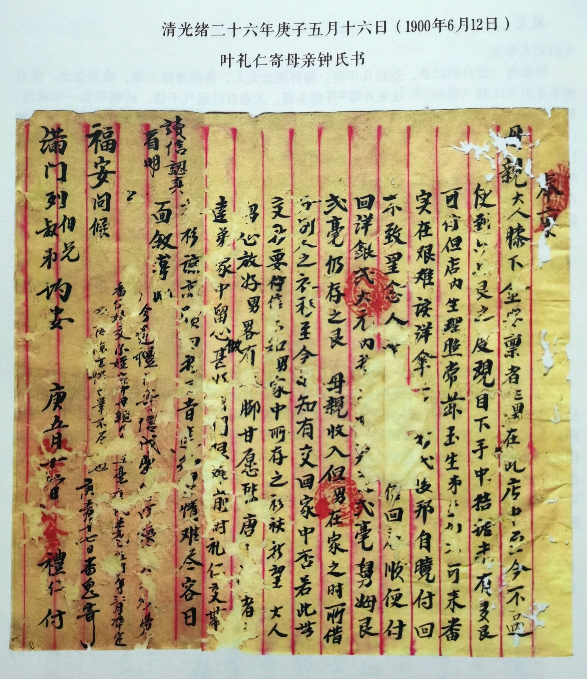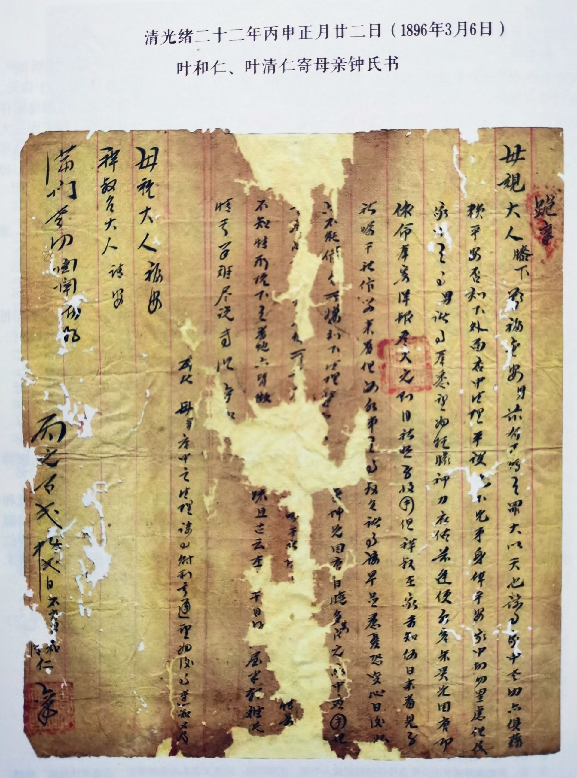 天有不测风云。叶和仁、叶清仁两兄弟苦苦经营的金店相继发生火灾,损失惨重,欲哭无泪。1896年3月6日,叶和仁、叶清仁在寄给母亲钟氏的批信中写道:“但男本年运气不嘉(佳),前月被火所累,坐困缧洩(绁)月余,幸得本家亚(阿)新叔担保,本(月)廿出来无事。店中生理以(依)然做回,但前日所用去四五十元之外,目今为手中拮据耳。”叶和仁时运不济,天降横祸,用心经营的金店意外发生火灾造成严重损失,更烦心的是因为此事被当局羁押一个多月,幸运的是得到了早在马来亚居住的叶氏本家亲戚亚(阿)新叔的关照与帮助,才得以释放。经过此次厄运,叶和仁的生意遭受重挫,需要重新选择开店做生意,购置用具等。1905年11月30日,叶和仁寄给母亲钟氏的批信中提到:“本(年)冬十月初十日因各店失火,烧有店法(房)拾于(余)间之则。男因时运不齐(济),失去家声(生),一并银千以(余)元之则。”再次遭遇火灾意外事故,难掩叶和仁悲伤的心情,也损失了房十多间、银千余元的惨重代价。祸不单行,叶和仁的弟弟叶清仁经营的金店也曾发生过大火。1898年8月12日,叶清仁写给母亲钟氏的批信谈到:“但男前在四里梦,开一打金店,开有三月之久,又被火烧,要赔人数目。幸得男身边长有多少银钱,以抵赔数,故不致受番帮(邦)之苦竟(境)。”叶家兄弟辛苦经营的小生意多次遭遇火灾意外事故,每一次火灾几乎把他们的基业毁于一旦,可见海外创业是何等的艰难。