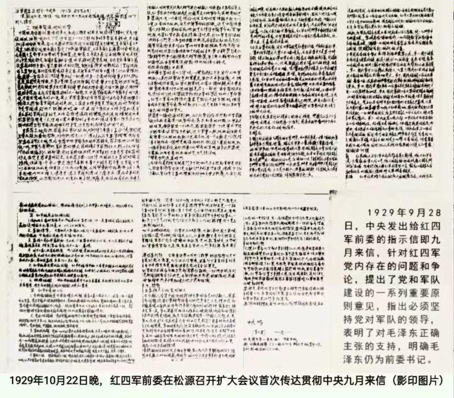 “1929年10月22日晚,红四军在梅县松源召开前委会(简称“松源会议”),首次传达贯彻落实中央九月来信,红四军官兵统一了思想认识,奔向古田。没有松源会议,就没有古田会议的顺利召开。
