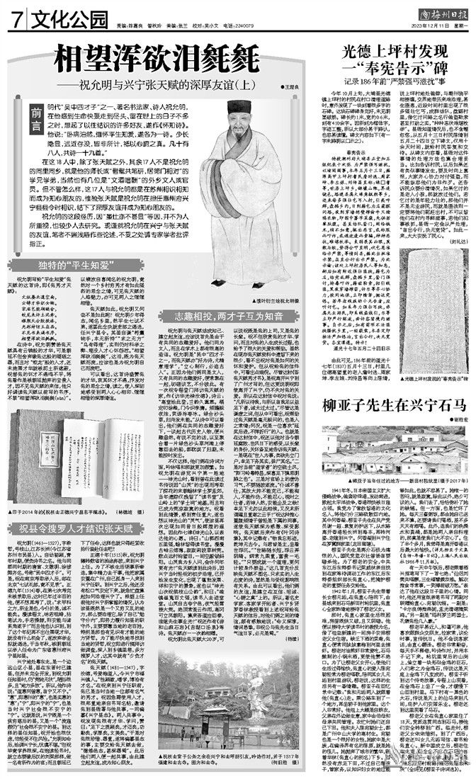 祝允明的这段经历,因“虽仕亦不甚显”等因,并不为人所重视,也较少人去研究。现谨就祝允明在兴宁与张天赋的友谊,笔者不揣浅陋作些论述,不妥之处请专家学者批评指正。
