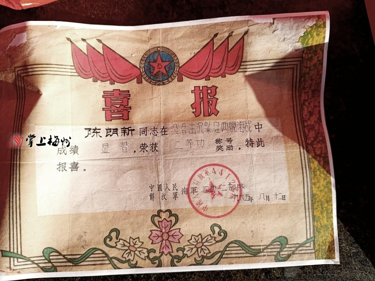 陈朗新在“八·六”海战海战中荣立二等功的喜报