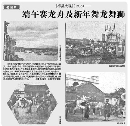 《梅县大观》“绪论”之“风俗”,主述婚丧习俗,对节庆礼俗几无涉及。书中“社会”专栏,则有四幅图片分别反映人们过端午节和新年时热闹喜庆之情形:万头攒动争看龙舟、端阳时节彩舟游河,以及新年景象之一 ·舞狮(舞狮为提倡武术之举,亦游戏之一种,每年初一二即出发人家舞狮,至月半内止,为新年增色不少);新年景象之二·舞龙(吾梅风俗,有舞龙之举,于夏历新年初七至十六日间送帖,晚上舞龙,俗称瑞气,增加热闹不少)。