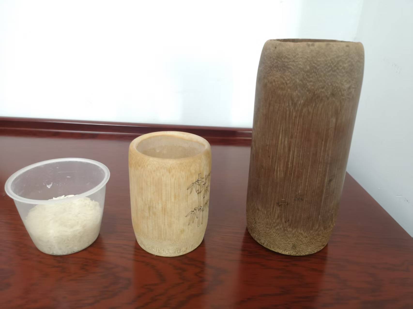 《吕氏春秋·仲秋》对角亦有描述:“正钧石,齐升角。”意思是说,要校正量器和衡器就要用石、升、角。角在升之后,显然比升小。在宋代,酒的容器种类繁多,有瓮、坛、桶、瓢、角、瓶、葫芦等。例如,《水浒传》第三回《史大郎夜走华阴县 鲁提辖拳打镇关西》,有一段描述鲁智深偶遇史进后,来到酒肆中畅饮的情景: 鲁提辖坐了主位,李忠对席,史进下首坐了。酒保唱了喏,认得是鲁提辖,便道:“提辖官人,打多少酒?”鲁达道:“先打四角酒来。”可见,宋时酒的计量就常用角。据研究,宋时的“四角酒”大概相当于当今的四至六市斤酒。不过,不同历史时期,角的实际容量是有差异的。现代汉语的“角”并没有容具的含义和用于计量了,而这个含义在客家方言里保留了下来。通常市售的电饭煲都会搭配一个量米的小杯子,这个杯子就叫“米角”。以前有人也会把热水瓶的盖子、炼乳罐头的罐子拿来舀米,这些器具也可称为“米角”。客家人所称的“角”除了具有杯子一样的功能外,尚可作量具,这是“角”与“杯”的最大区别。米角、米合(gě)、米筒(见图②)都是常用量米器具,都呈圆筒状,或像杯子一样,民间也常常把它们混为一谈。实际上,它们之间还是有些区别的。米角、米筒只限于民间使用,容量并无具体的规定,而米合则不同,合、升、斗、石是十进制的关系,是官方使用的计量单位。总的来说,米筒的容量比米合大,而米角的容量则较随意,或是在米合容量之上,或是在米合容量之下。另外,米筒、米合一般是竹筒裁截、刨制而成,而米角的制作材料可以是竹木、塑料或金属。在客家方言里,“角”作为容器、量具的含义,除了水角、酒角、米角外,应用上还可以扩展,比如把纸折成的袋子、容器也叫“纸角”。民间有句俗语“纸角装盐爱包咸(涵)”,这是双关语,意思是望对方多多包涵。