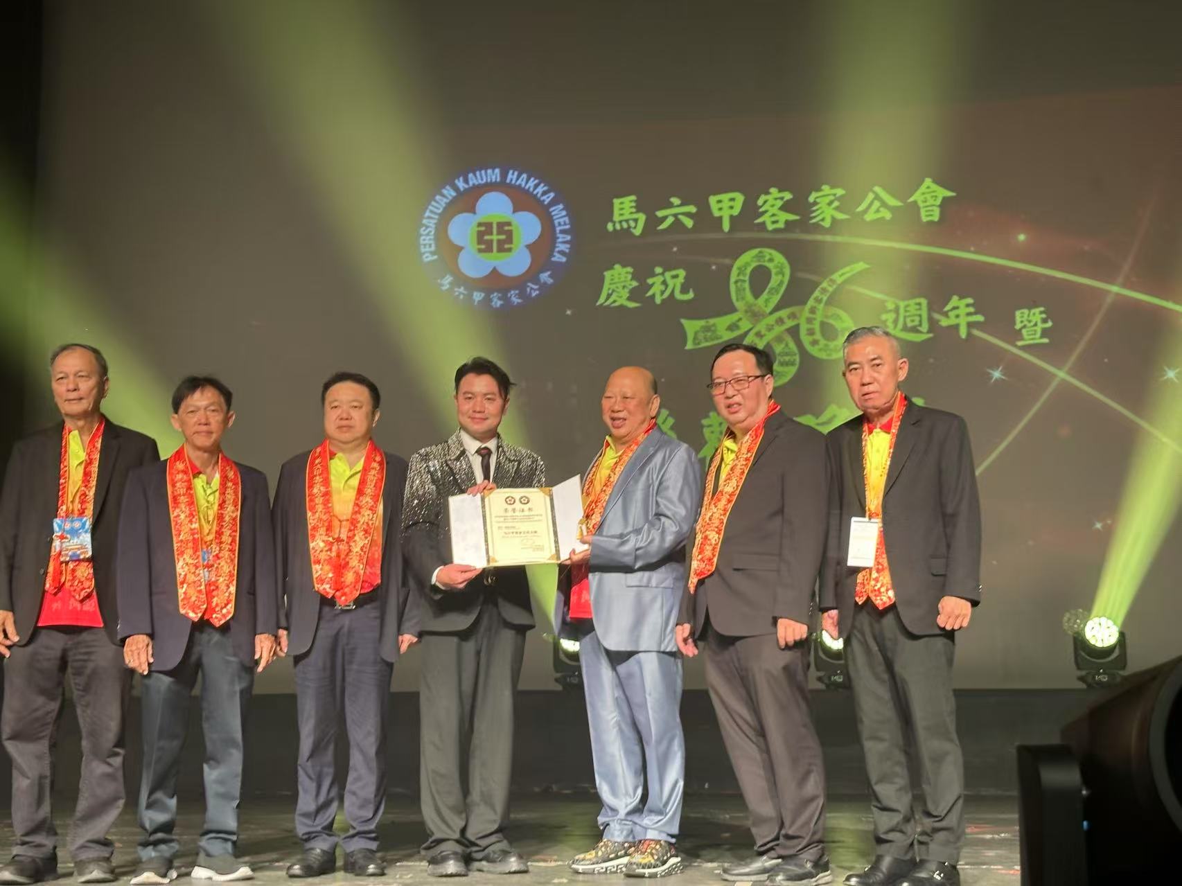 在大家的共同见证下,梅州最美文艺志愿者、知名音乐人及“客家三宝”组合创始人陈善宝荣获“马六甲客家文化大使”荣誉称号。
