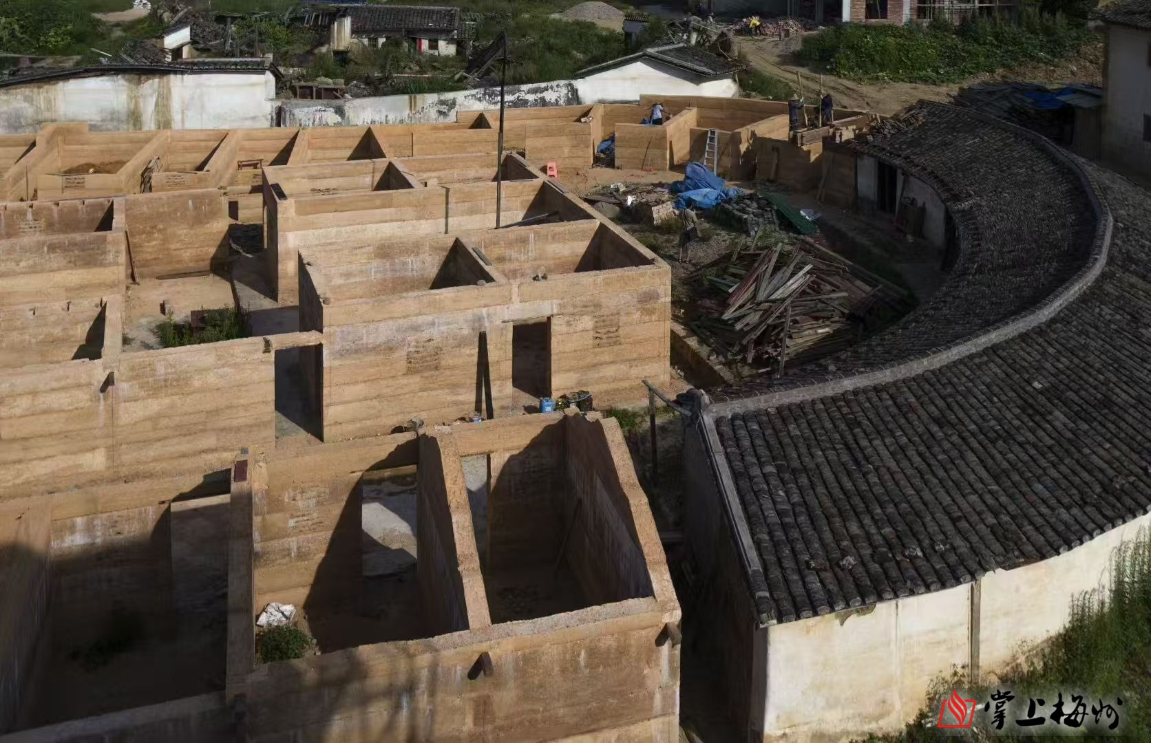 夯土筑墙是梅州客家地区的一种传统建筑技术,主要由土壤、水、黏合剂(如石灰或水泥)等材料混合后夯实而成。它具有良好的保温隔热性能和一定的抗震能力,是历史上许多建筑修建的主要方式,直至20世纪六七十年代,仍在农村建房时广泛使用。随着混凝土、预制砖和铝钢材料在建房方面的大量应用,夯土筑墙技术面临消失,现仅在古建筑的维修方面仍然使用到这种夯土筑墙技艺。图片是笔者于近日拍自梅州市梅县区松源镇蔡蒙吉故居(围龙屋)于2024年梅州“6·16”特大暴雨灾后重建现场。