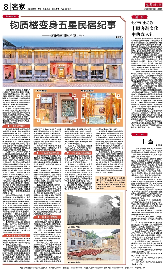 笔者于2017年初识钧质楼,历经租赁、改造、试业至开业,至今已逾八载。这座曾寂寂无名的老宅,如今蝶变为梅州知名的五星民宿。2020年底,央视纪录频道播出的《回到围屋》中的其中一部分,就是讲述我们团队修缮改造钧质楼的故事。作为项目主导者与亲历者,往昔种种仍历历在目。