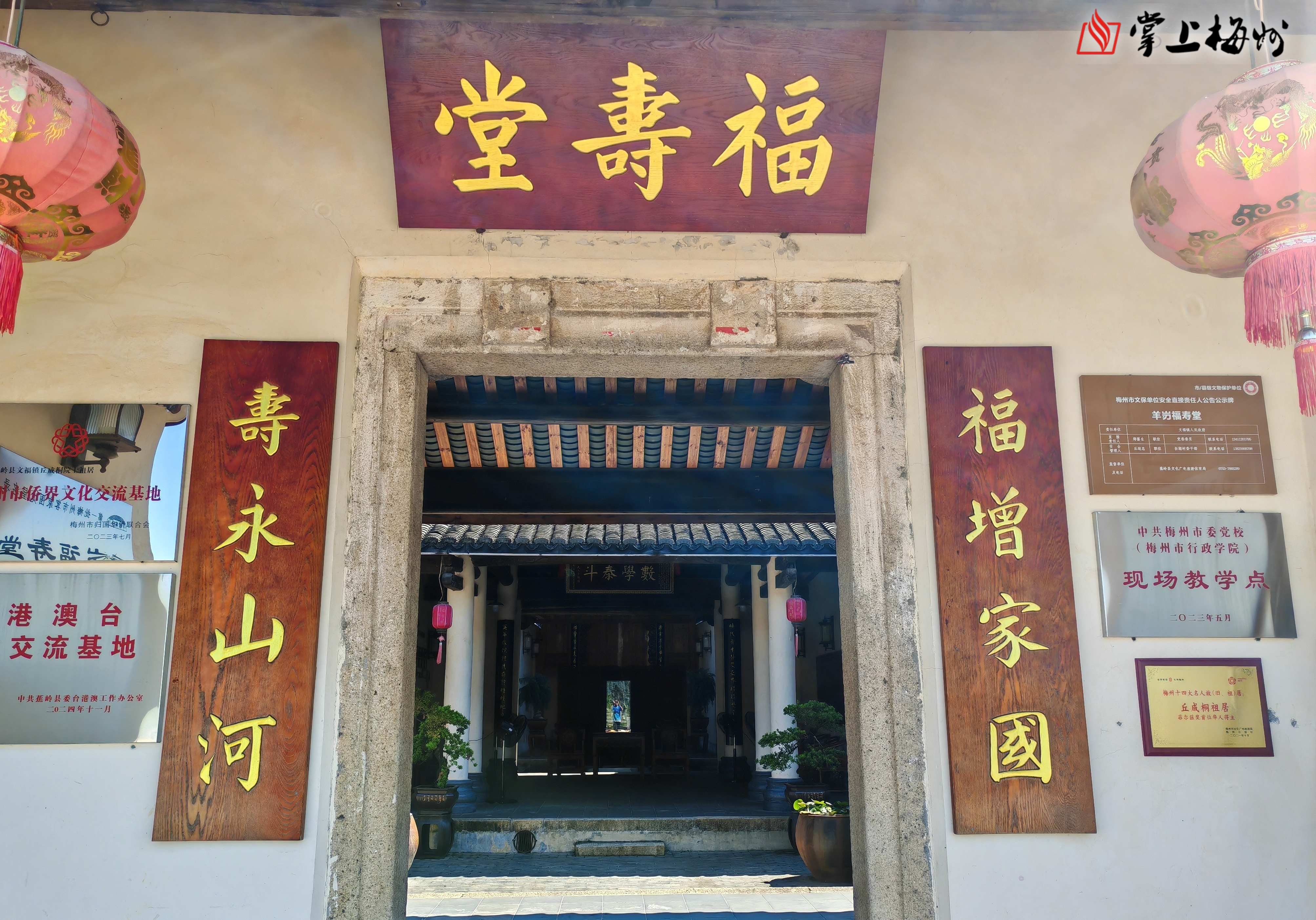 你看,福寿堂正门联,上联:福增家国;下联:寿永山河。福寿堂有三堂两横四围,是典型的客家围龙屋建筑。走进福寿堂,映入眼帘的是中堂联,上联是:旷代奇才声斐世界熠熠繁星宗北斗;下联:英年俊杰踵武前贤曈曈旭日出东方。中堂上方悬一横匾:数学泰斗。对联熠熠生辉,颂扬羊岃村人才辈出。再进去能看见上堂联和栋顶联。栋顶联上联:源宗渭水族望河南发轫杭川追宋末;下联:姓肇营丘支蕃岭表迁基羊岃数明初。道明了丘氏始祖来自山东营丘,丘穆世族抽枝散叶,一代一代繁衍生息,因连年战乱,不断举家南迁,最后在南粤东北山区镇平县文基乡(现蕉岭县文福镇)落户,成为开居始祖的历史渊源。福寿堂四围门联分别是——上联:文能载道;下联:理可兴邦。横批:文理清芬。上联:上庠谟训;下联:国士门庭。横批:上国辉光。上联:田园淘史;下联:诗礼传家。横批:村史馆。蕴含着浓浓的“修身齐家治国平天下”的理想抱负。羊岃村历代丘氏家族发扬祖辈勤劳奋发,耕读传家,礼仪诗书的优良传统,世代接踵,培养出一辈又一辈优秀人才。