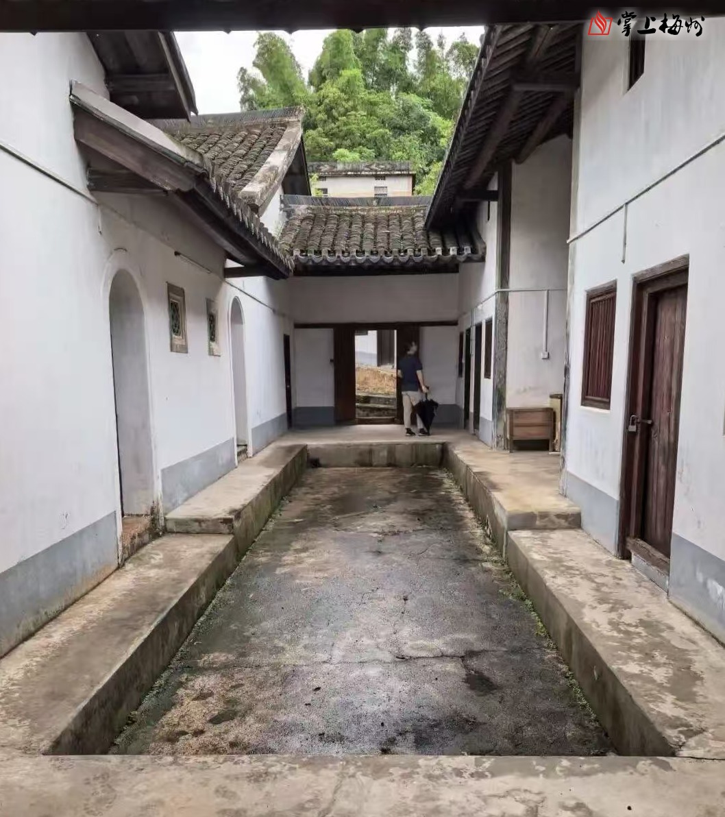 沿门厅屏门进入的是建筑正中位置的天井部分,天井深约30公分,四周由花岗岩条石收口,天井周边走廊地面为红色水泥压花过面三合土地面;建筑两侧横屋以通长天井与中间主体建筑分开,两端则是前后门厅。