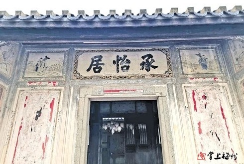 建筑外门楼(梅州称“斗门”)为典型的梅州地区两坡顶斗门,仅有一副石头门框的双开木门,左下方开有一个“财门”(即狗洞)。门楼的硬山墙为“木”型装饰,上五级台阶跨过斗门后进入庭院;“承怡居”的装饰精美,檐口以灰塑线条和约20多公分宽的装饰泥水壁画装饰。主门楼为凹式门楼,门框为标准尺寸的石头门框,框上用篆书雕刻“福寿”字样门印,上方为灰塑门楼匾额,匾额边框为黑底草花纹样,以灰塑牡丹承托,匾额白底黑字楷书“承怡居”三个大字,稳重大气。大门两侧及内凹处墙壁的灰塑镶板造型层次丰富,工艺精致,白色和浅朱砂红配色柔和,搭配比例得当。镶板上绘制有梅花鹿、仙鹤及仙人童子的场景壁画,寓意“福禄寿”;芙蓉锦鸡、花开富贵壁画,寓意“锦上添花平安富贵”。