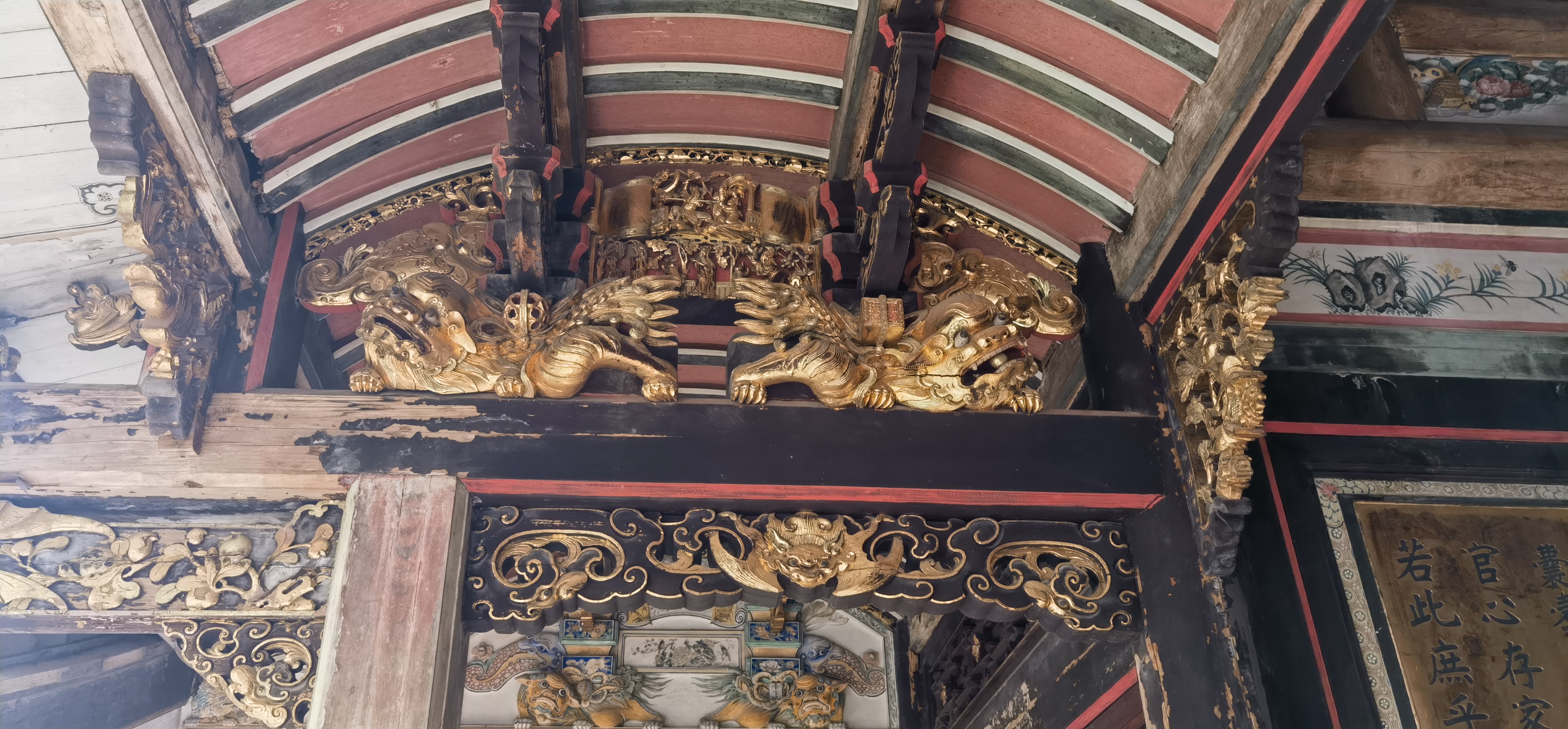 此外,楼内装饰融汇中西,木雕、石雕、瓷雕与彩塑技艺精湛,梁柱斗拱处饰有金麒麟、凤戏牡丹等华丽浮雕,与彩色玻璃花窗等南洋元素共同映衬出楼主人家深厚的儒家修养与开放的侨乡视野。