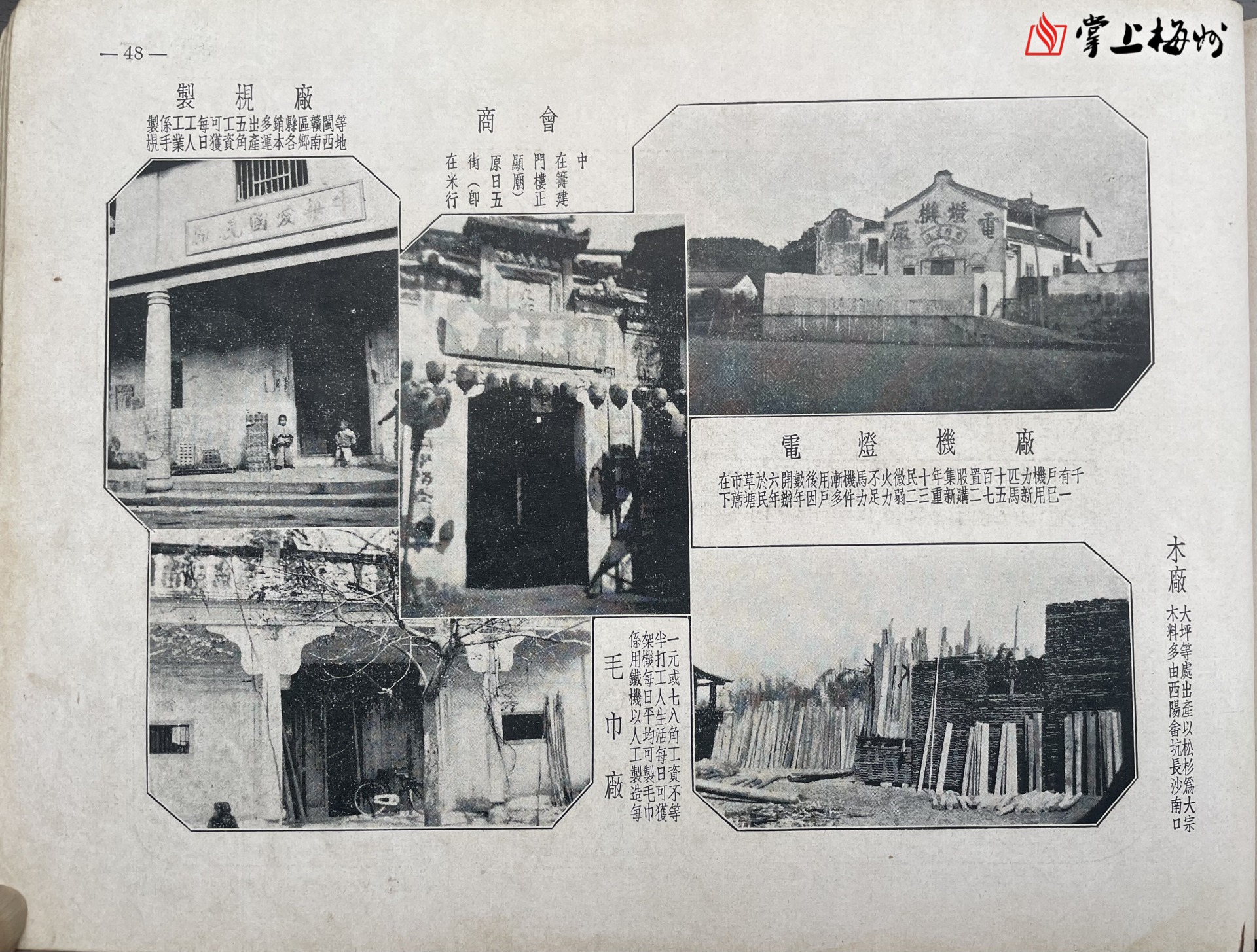 在书中刊登“工厂”“商会”照片的那一页面中,与制枧厂、毛巾厂、木厂照片一起的,有“电灯机厂”图一幅,并附有如下说明:在下市席草塘,于民六年开办,数年后因用户渐多,机件马力不足,火力微弱,民二十三年重集新股,购置两百七十五匹马力新机,用户已有一千。(王建生/供图 采微/文字整理)
