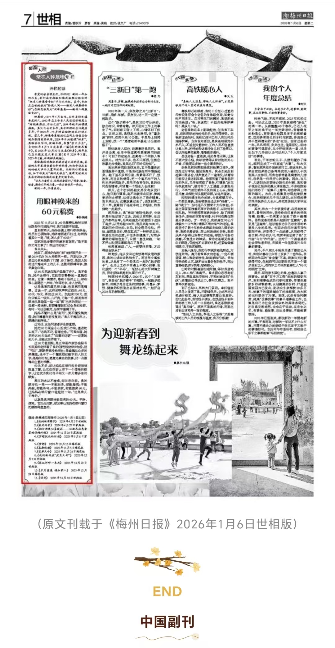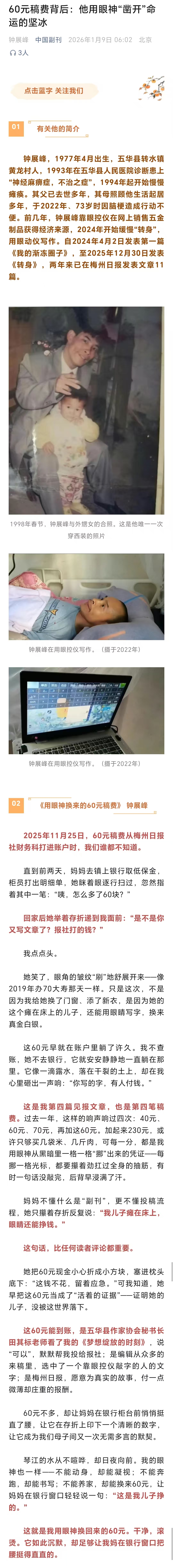 中国副刊报道《60元稿费背后:他用眼神“凿开”命运的坚冰》