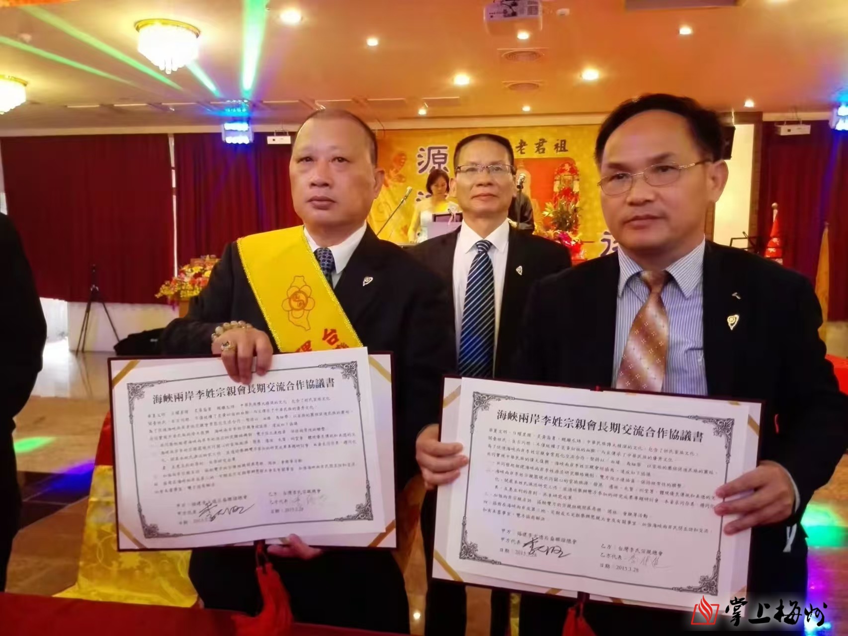上杭李氏大宗祠管委会(李火德裔孙联谊总会)与台湾李氏宗亲总会签订永久交流协议。(李世盛/摄)