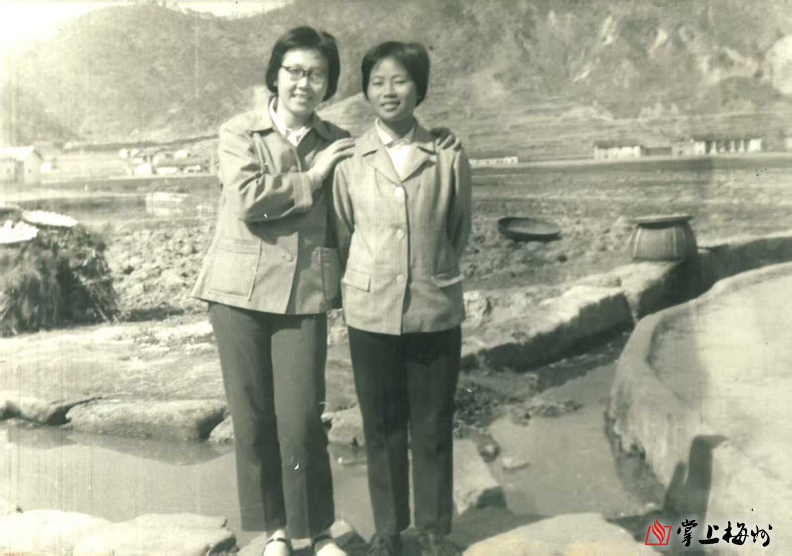 ▲西楼里的女生们在周溪河边合照(后排右一是本文作者)。