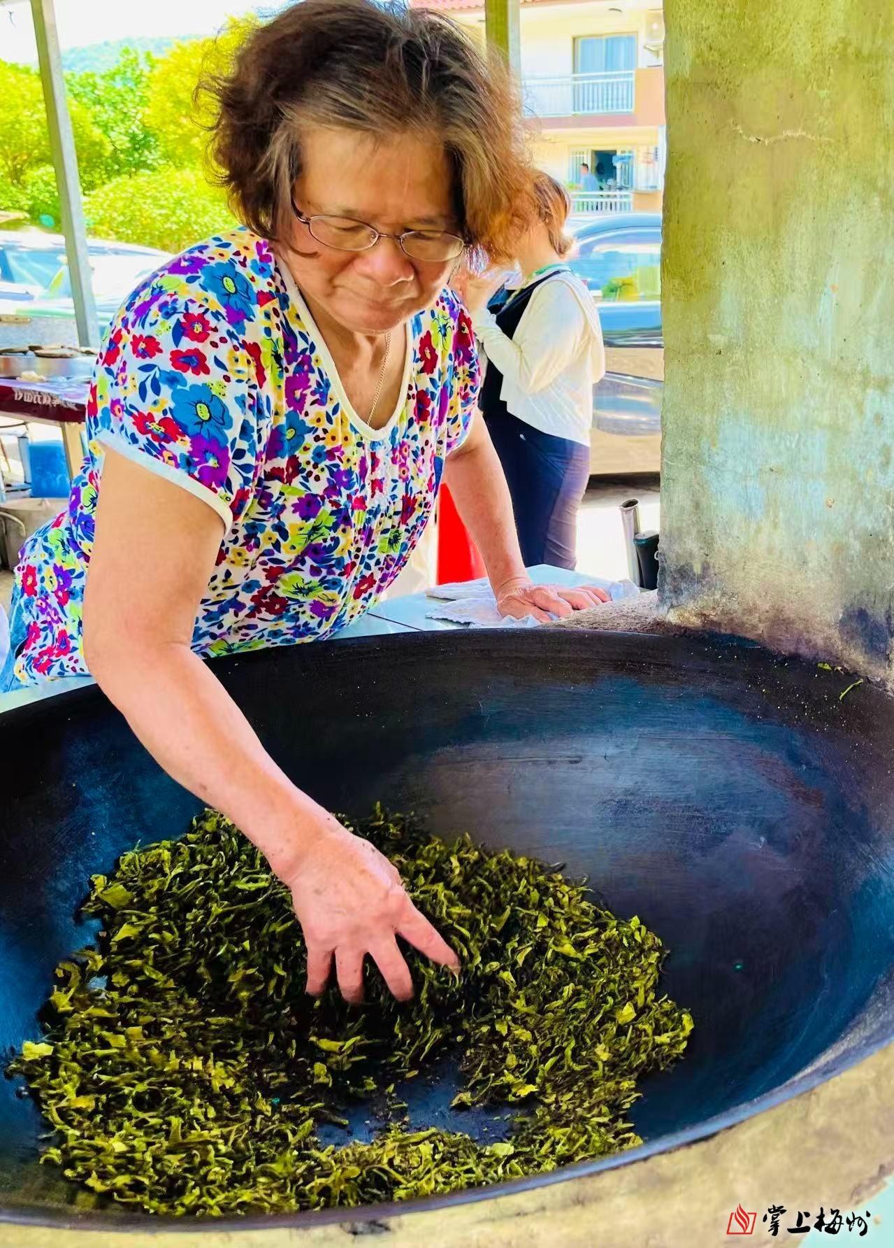 茂草岩有一处供村民及行山客沏茶歇脚或节庆欢聚吃盆菜的大禾坪。每年采青季,就是静寂的村落最热闹之时。村民从山上采摘回来的茶叶嫩芽青翠欲滴,放在柴火熊熊燃烧的大型铁砂锅上翻炒。令人惊叹的是,一位叫洪英姐的村妇,双手上下翻飞,翻弄茶叶,真正的纯手工。她说整个制作过程的重点亦是难点,就是把握火候。稍有不慎,茶叶就焦糊了;若担心烫手,则茶叶的自然香醇又“逼唔出来”。问为何不用锅铲或戴粗布手套?洪英姐说,“只有赤手最自如,还能感受到炒茶的热力和温度”。