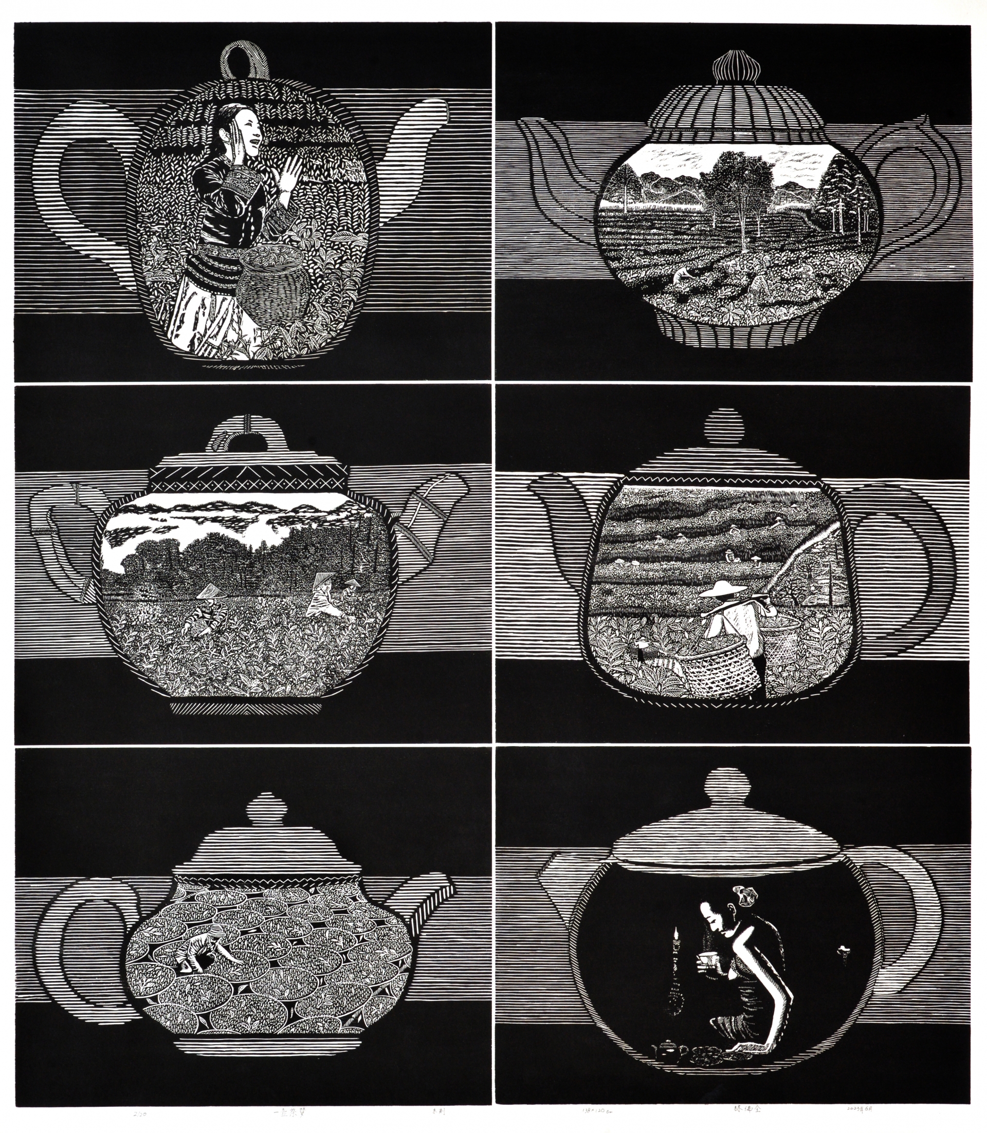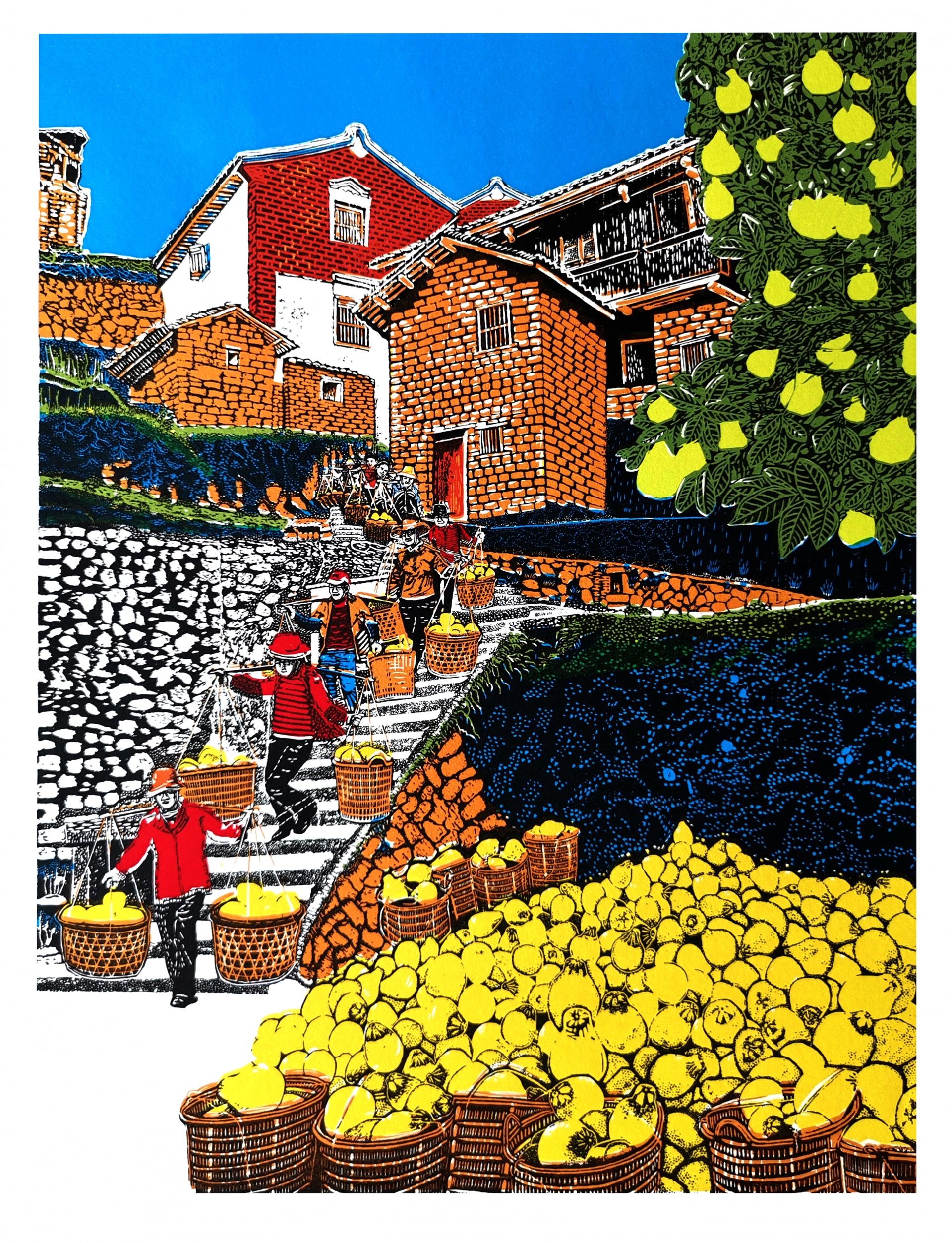林佛全版画创作主题高度聚焦客家故土——梅州。金柚、茶山、采茶村姑、客家人、足球少年等形象,并非浮光掠影的风情速写,而是融合了个人生命记忆与集体文化认同。他将对时代变迁的观照、对日常生活的体悟、对乡土人文的礼赞,全部凝聚于刀锋之下。刻痕之间,回荡的是对历史的回望、对生活的热爱,承载着厚重的乡愁。(作者系兴宁市文联原主席)