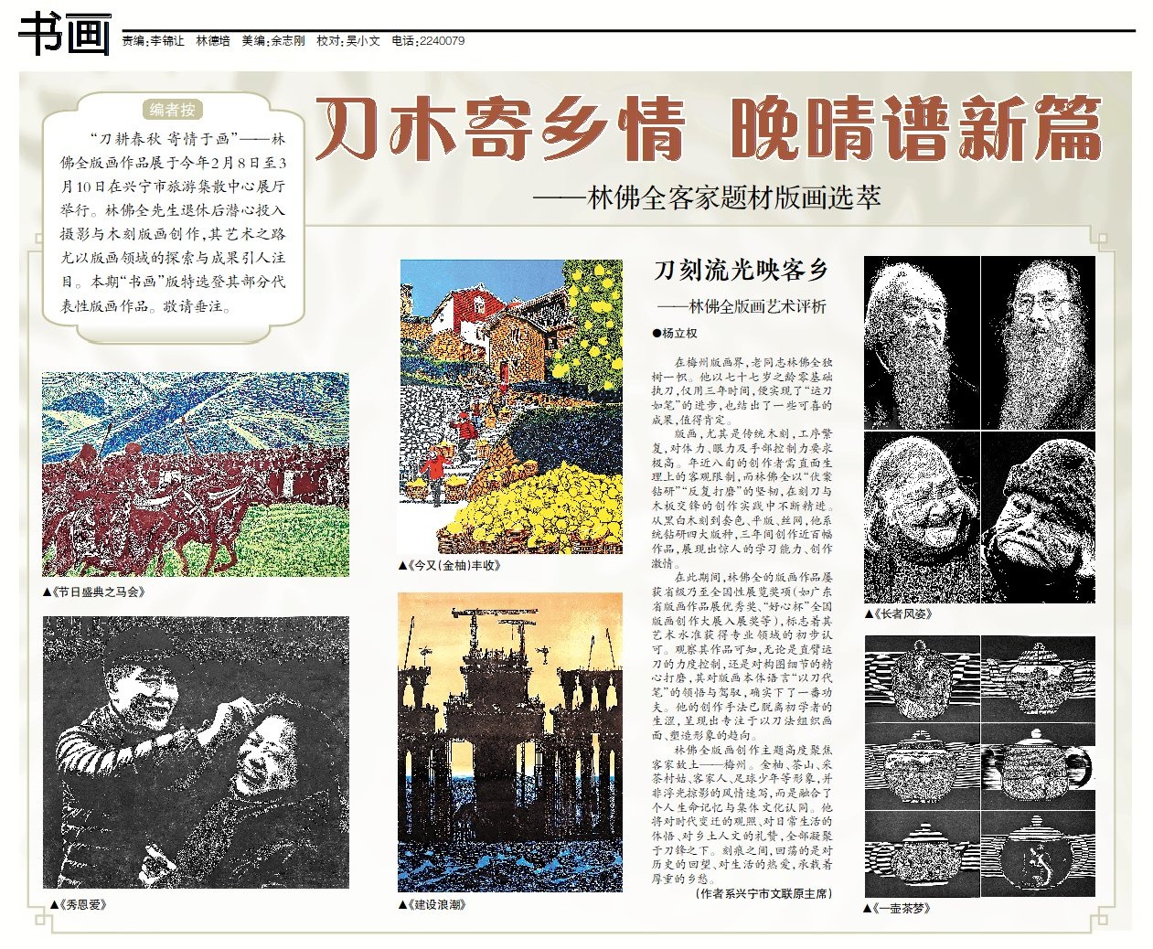 在梅州版画界,老同志林佛全独树一帜。他以七十七岁之龄零基础执刀,仅用三年时间,便实现了“运刀如笔”的进步,也结出了一些可喜的成果,值得肯定。