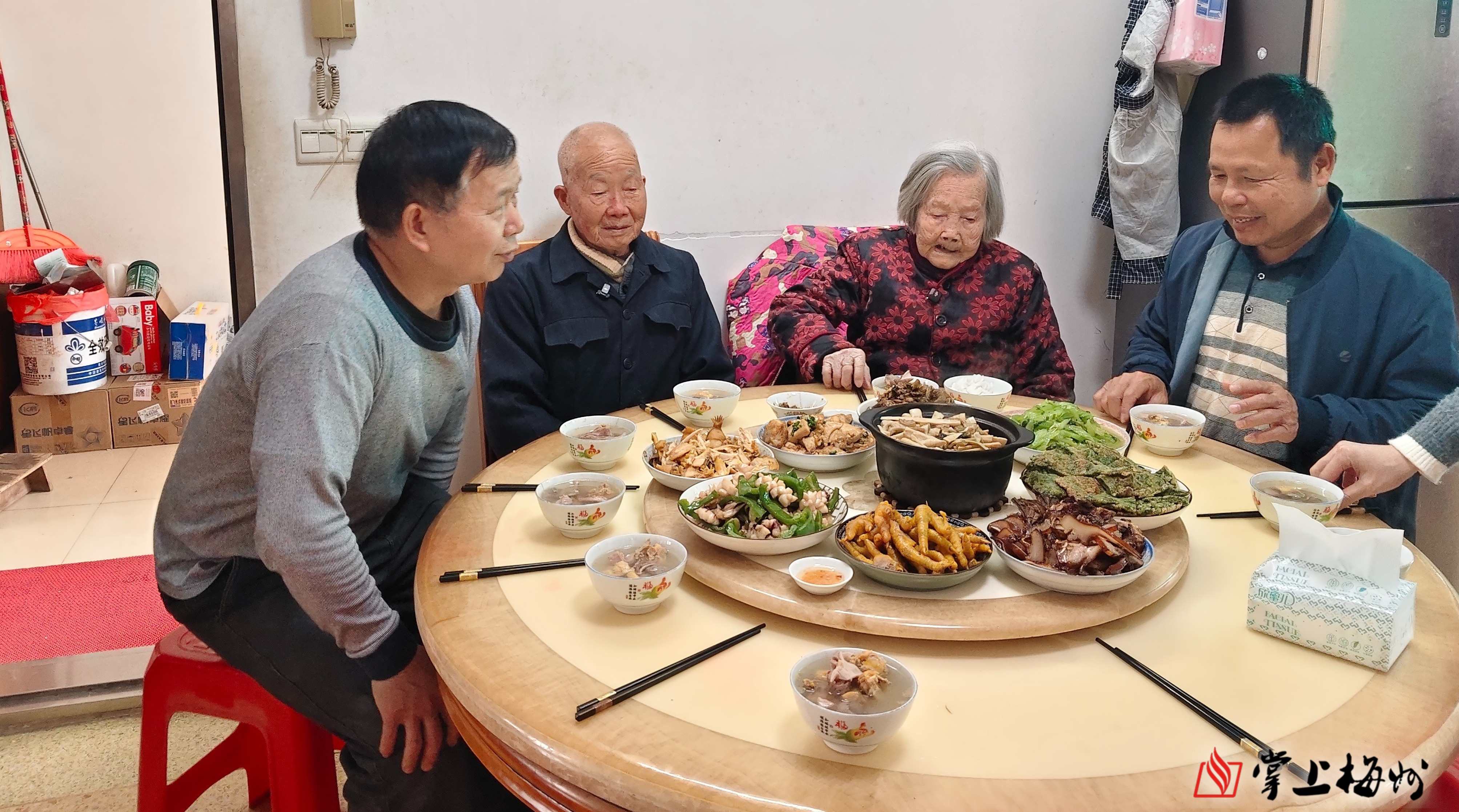 不知不觉到了饭点。老姑婆赖祝娘拉着弟弟的手下到七楼用餐。我们有幸能与两位百岁老人同桌。席间,姐姐不时细心地为弟弟夹菜送饭。弟媳更是体贴入微,拿着剪刀将猪肉、鸡肉等仔细剪成小块,方便两位老人食用。这真是典型的客家好媳妇!我悄悄问鲍老师的女儿:“你们平时都是这样照顾老姑婆的吗?”她们点头笑道:“是啊,每天都这样。”钟编导竖起大拇指,连声赞叹:“真是孝顺!”我仔细观察,两位老人都吃得津津有味,一人一碗饭,配上一碗汤。