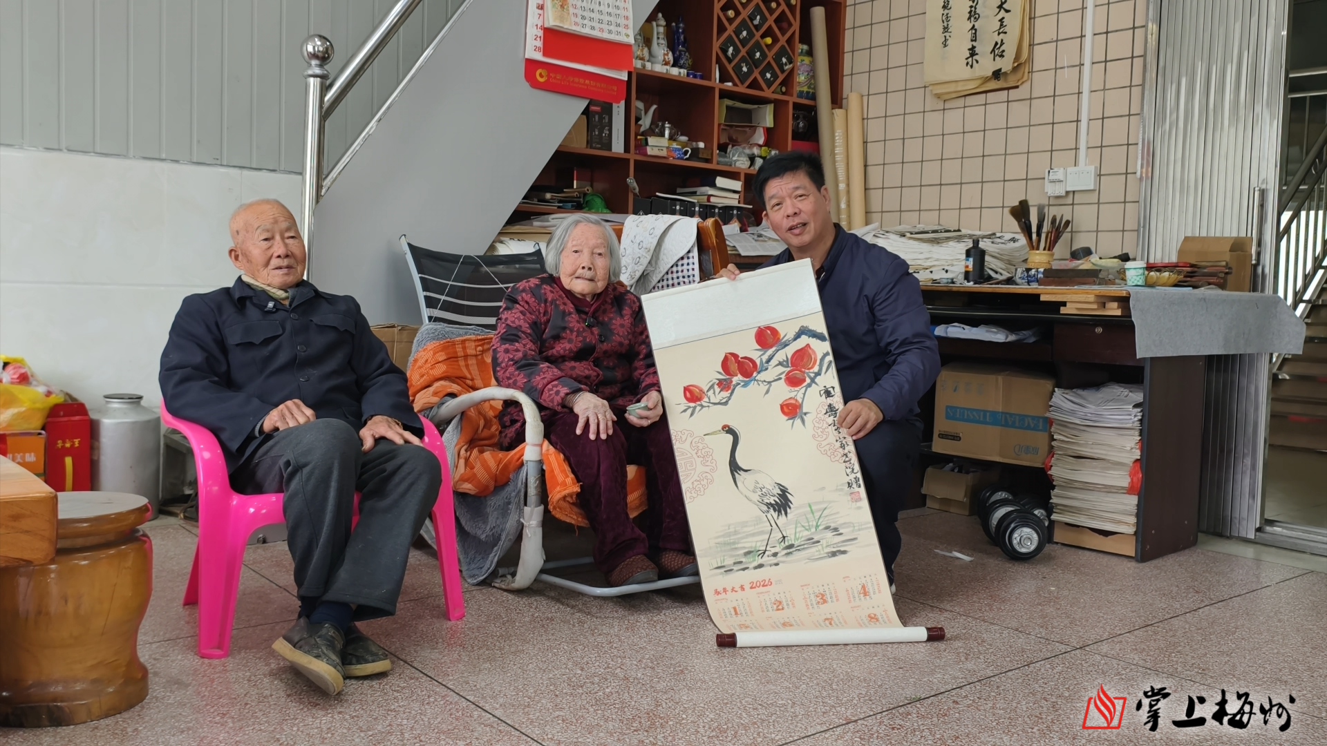 本文作者给赖祝娘(中)和赖永芳(左)姐弟赠送《鹤寿图》。