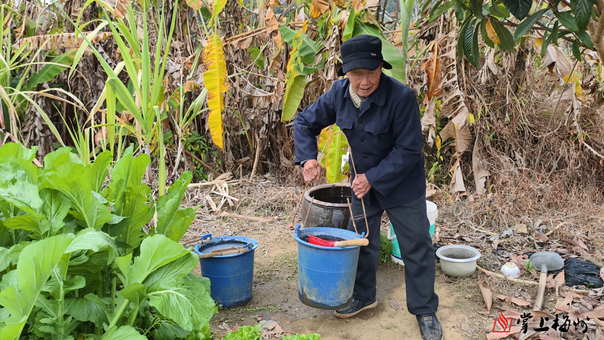 我们先在西河镇南峰村的大湖里接上赖德祥,他正忙着在菜市场采购肉蔬,随后驱车前往目的地。抵达赖伯家时,他却不在。我们心想,或许是去山上菜园忙碌了。果然,当我们气喘吁吁爬上山坡,却仍未见到老人的身影。“快九十岁的老人家了,会跑到哪儿去呢?”我们心里都有些着急。正当焦急寻找之际,只见赖伯从菜园旁的树丛中缓缓走出。原来,是菜园的浇水管断了,他忙着修理去了。“哎呀,这哪是八九十岁老人该干的活儿!”——我不禁脱口而出。老人一边和我们说着话,一边指着天上的鸟儿,笑着说它们快把青菜偷吃光了。说完,他便准备挑水浇菜。偏头一看,扁担竟忘了带上,只见他毫不犹豫地拿起旁边一只装满水的尿桶,双手稳稳提起,健步如飞地将水提到十几步开外的菜畦旁,一气呵成地浇灌起来,把我和钟编导看得目瞪口呆。赖德祥在一旁补充道:“上山挖笋、庭院劈柴这些农活,我爸样样都比我们强!”这话听得我脸上阵阵发热。