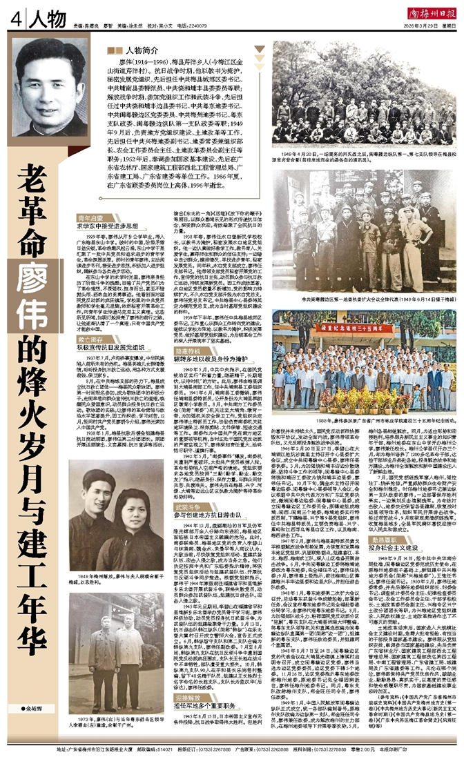 1949年9月14日,经中共中央华南分局批准,闽粤赣边区党委完成历史使命,在原梅州地委班子基础上,新组建中共兴梅地方委员会(简称“兴梅地委”),王维任书记,廖伟任副书记。1950年2月,廖伟任地委常委,并先后兼任地委组织部长、妇委会书记、调查统计委员会主任、纪律检查委员会书记、农会工作委员会主任、干部学校校长、土地改革委员会副主任、兴梅专区兴宁土改分团团长等职,为兴梅地区党组织建设、人民政权建立、土地改革推进作出了不可磨灭的贡献。