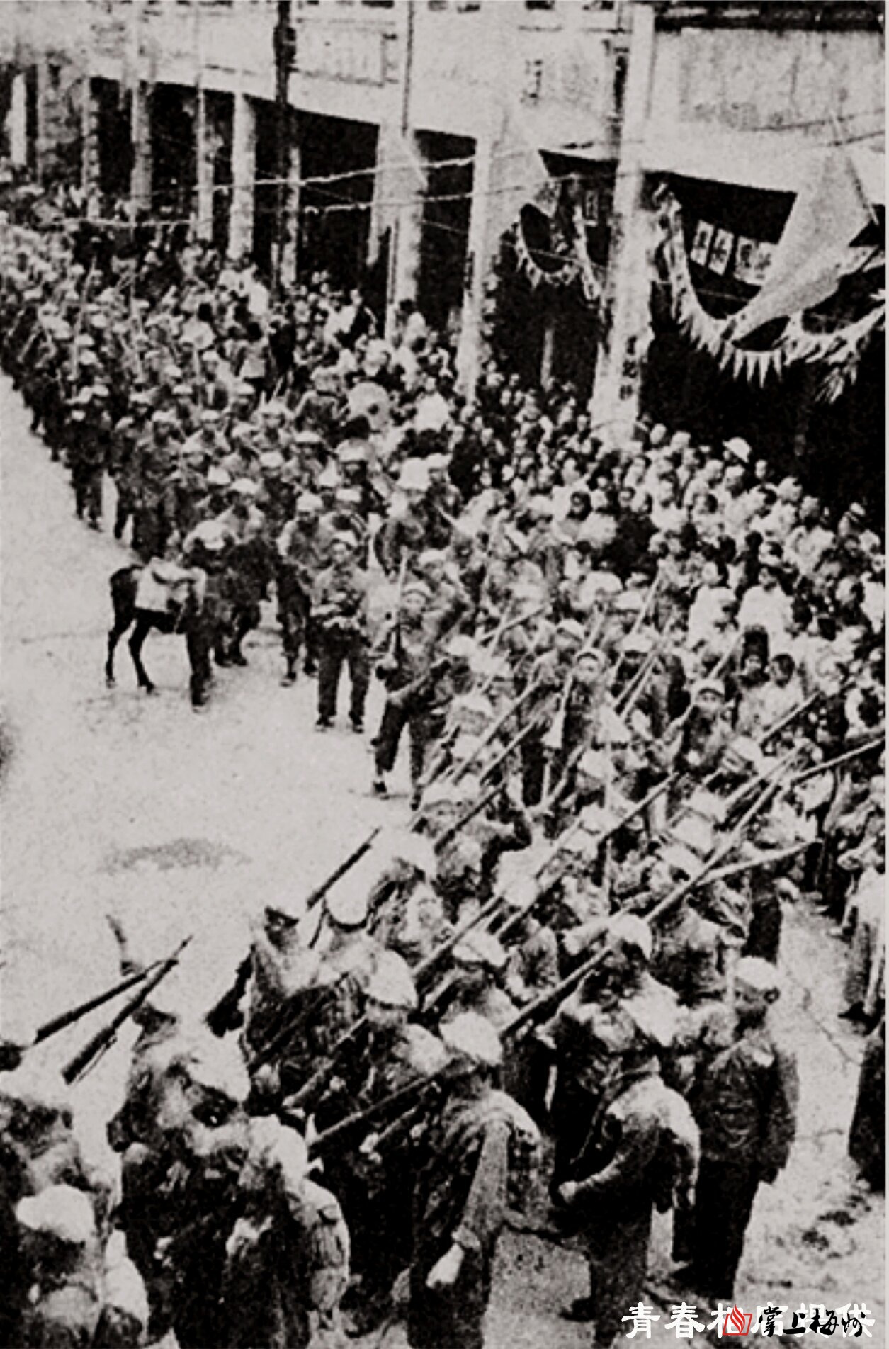 1949年5月,解放军进入梅城,群众夹道欢迎。