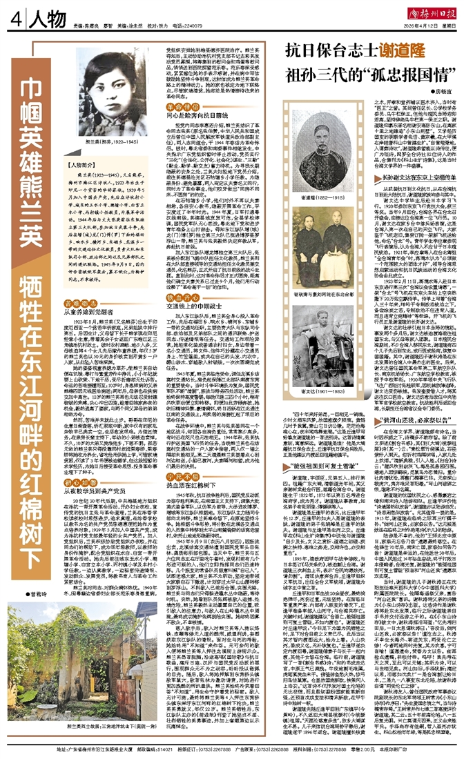 熊兰英(1923—1945),又名熊芬,梅州市梅江区泮坑人,1923年出生于印尼一个贫苦的华侨家族。1939年5月加入中国共产党,先后在泮坑村小学、城东的玉水小学、潮塘小学、白宫立本小学、丙村镇小任教员,开展革命活动。1944年后与丈夫张英前往东纵独立第三大队部,参加抗日武装斗争,先后在增(城)龙(门)博(罗)下面的福田乡、响水乡、横河乡、东铺乡、龙溪乡一带的交通站任文化教员,负责大队和东纵司令部、政治部之间以及兄弟部队之间的通讯联络。1945年9月9日,因内奸告密被敌军袭击,寡不敌众,为掩护同志,不幸被俘,英勇牺牲。