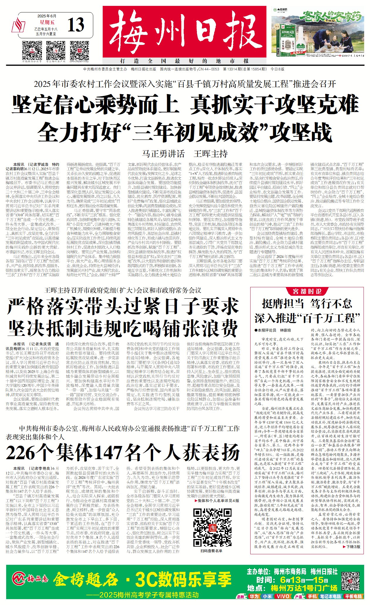 昨日,市委农村工作会议暨深入实施“百县千镇万村高质量发展工程”推进会及专题培训举行,再一次奏响了深入实施“百千万工程”的强音,鼓舞了各级党员干部干事创业的士气,只要我们把“百千万工程”当成一个历史机遇、一件头等大事、一套集成式改革、一项全社会行动,从严从紧要求,落细落实举措,就一定能走出一条具有梅州特色的高质量发展之路。