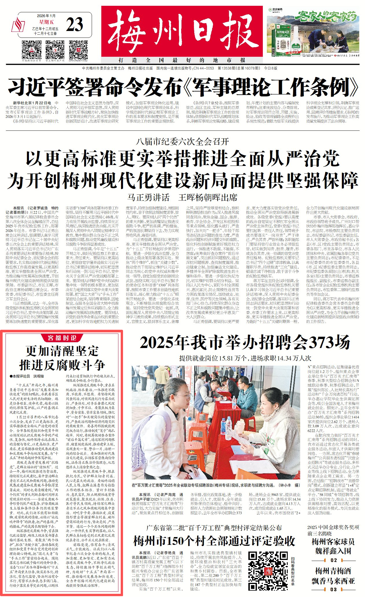 腐败是高质量发展的“拦路虎”,是群众福祉的“侵蚀剂”。过去一年,梅州纵深推进惩贪治腐,持续深化正风肃纪,集中整治群众身边不正之风和腐败问题,推动党风廉政建设和反腐败斗争取得显著成效。同时也要清醒看到,“两个仍然”的重大判断在梅州同样具有现实针对性——当前反腐败斗争形势仍然严峻复杂、铲除腐败滋生土壤和条件任务仍然艰巨繁重。对此,我们决不能有松劲歇脚、疲劳厌战的情绪,必须以“永远吹冲锋号”的执着,把严的基调、严的措施、严的氛围长期坚持下去。