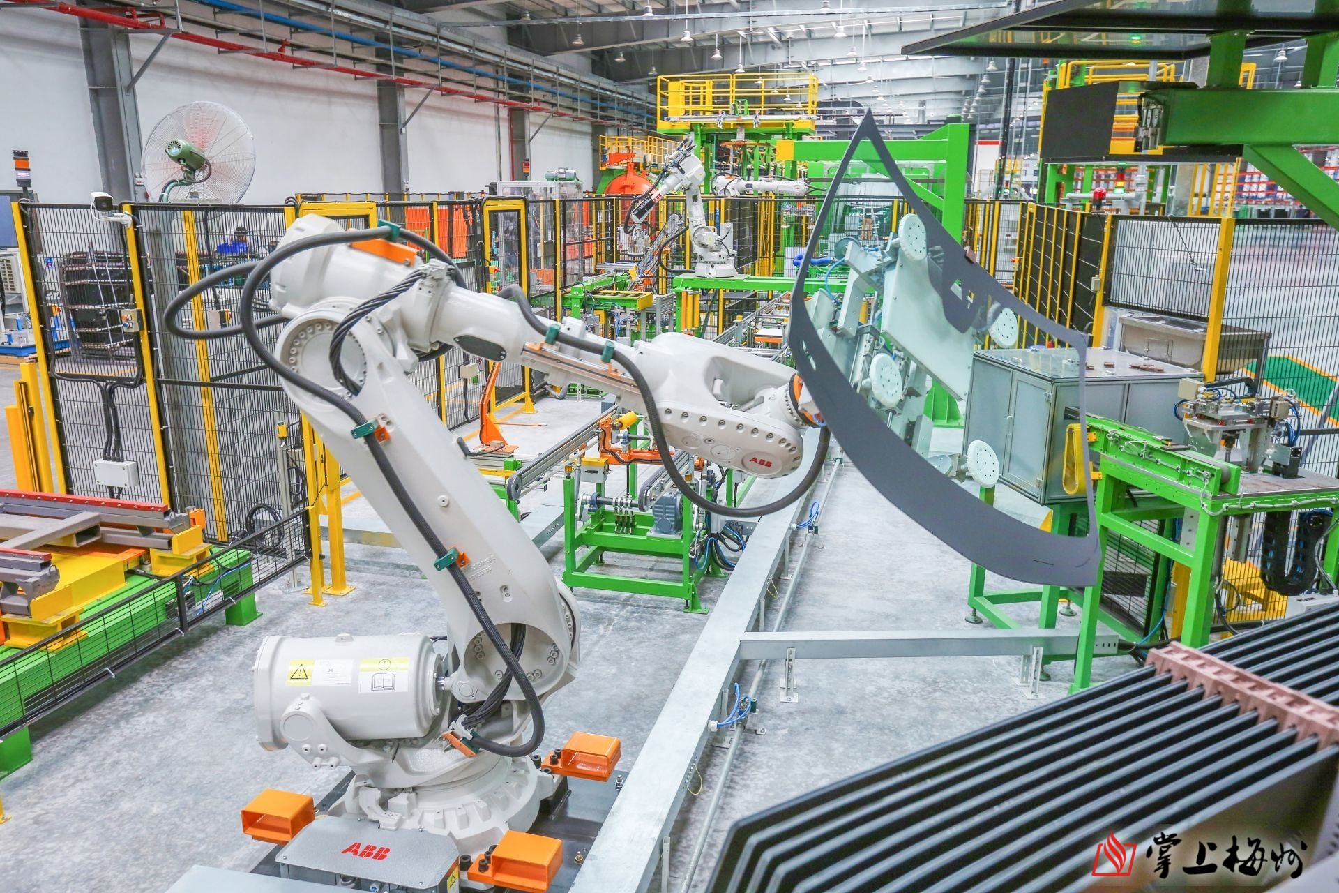梅州圣戈班高端汽车玻璃生产项目车间一角。(吴腾江 摄)