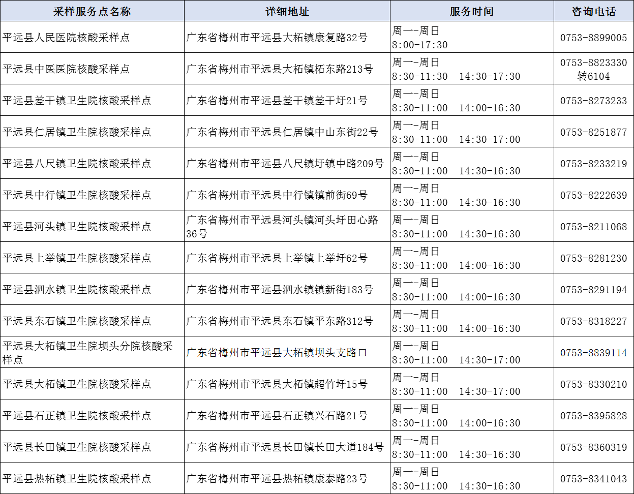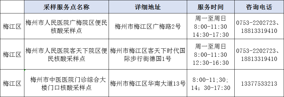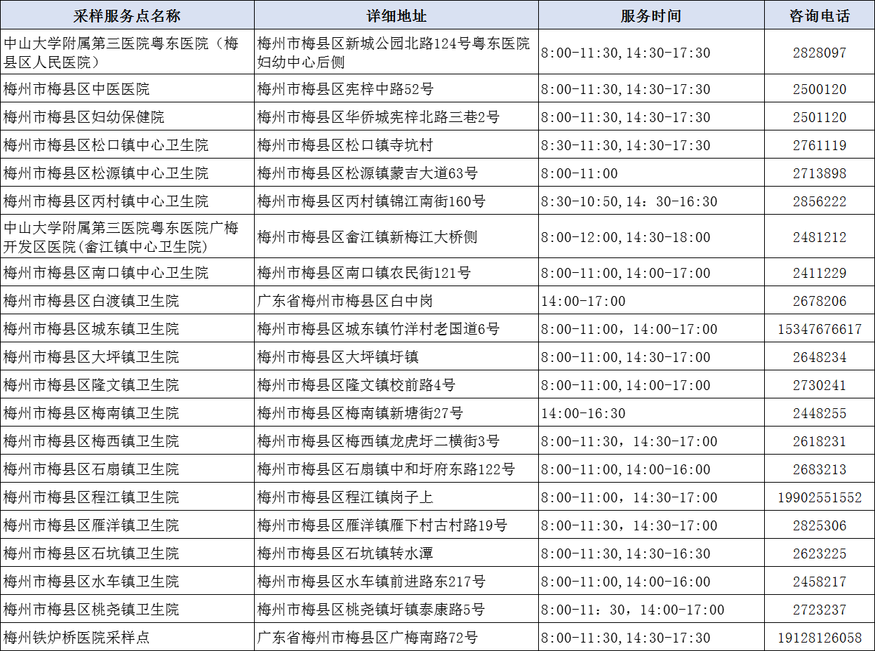 掌上梅州讯 1月18日,我市公布159个“愿检尽检”便民核酸采样服务点,其中梅州市人民医院广梅院区便民核酸采样点、梅州市人民医院客天下院区便民核酸采样点、 梅州市中医医院门诊综合大楼门口核酸采样点可出具英文新冠病毒核酸检测报告。