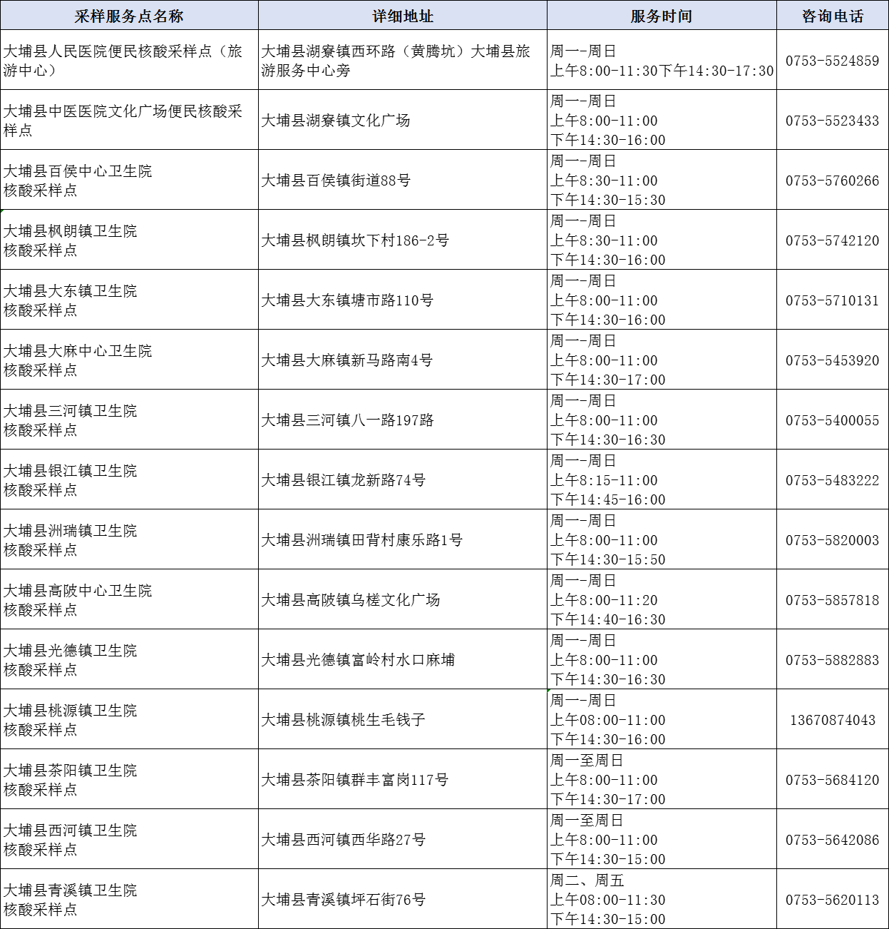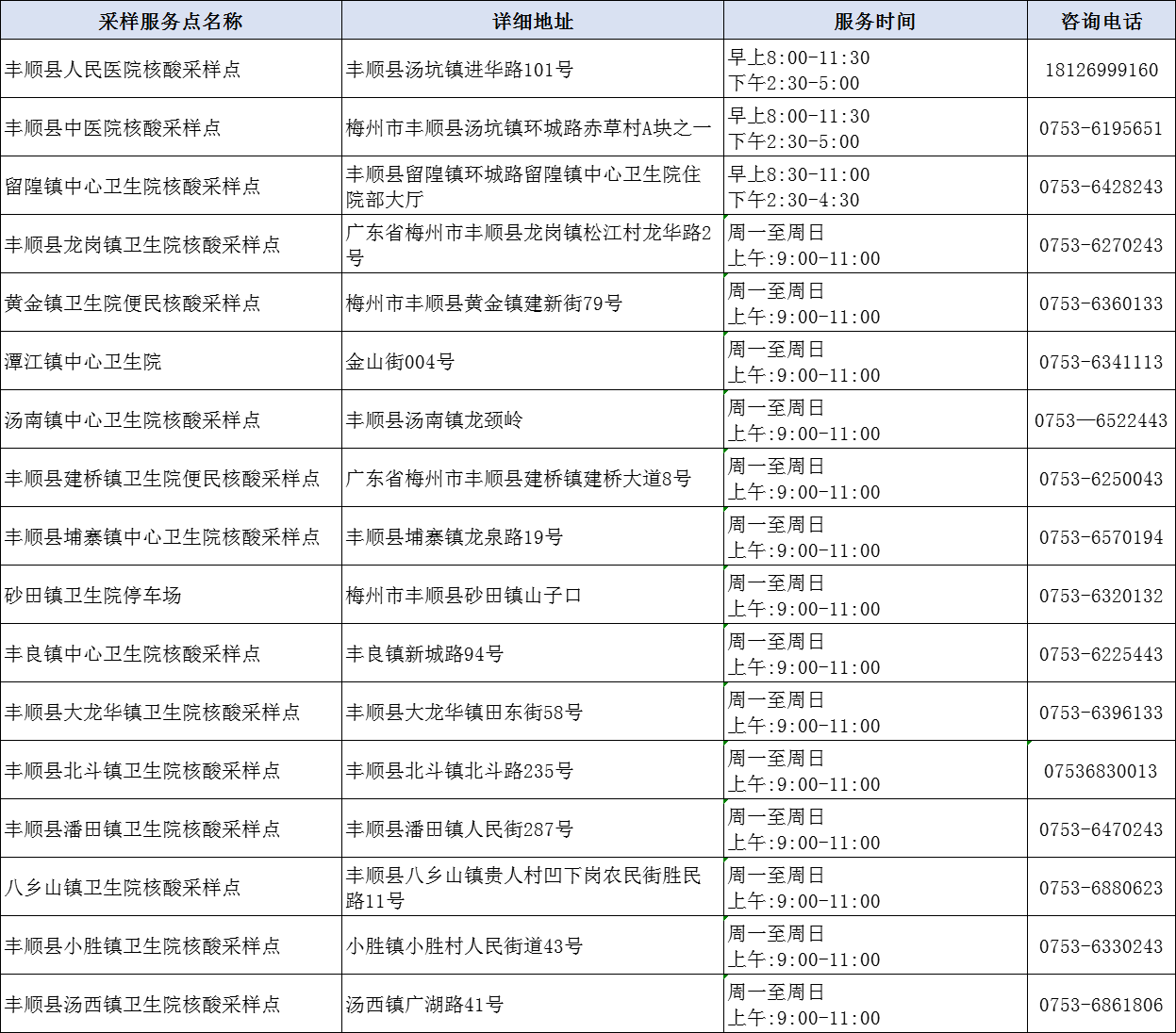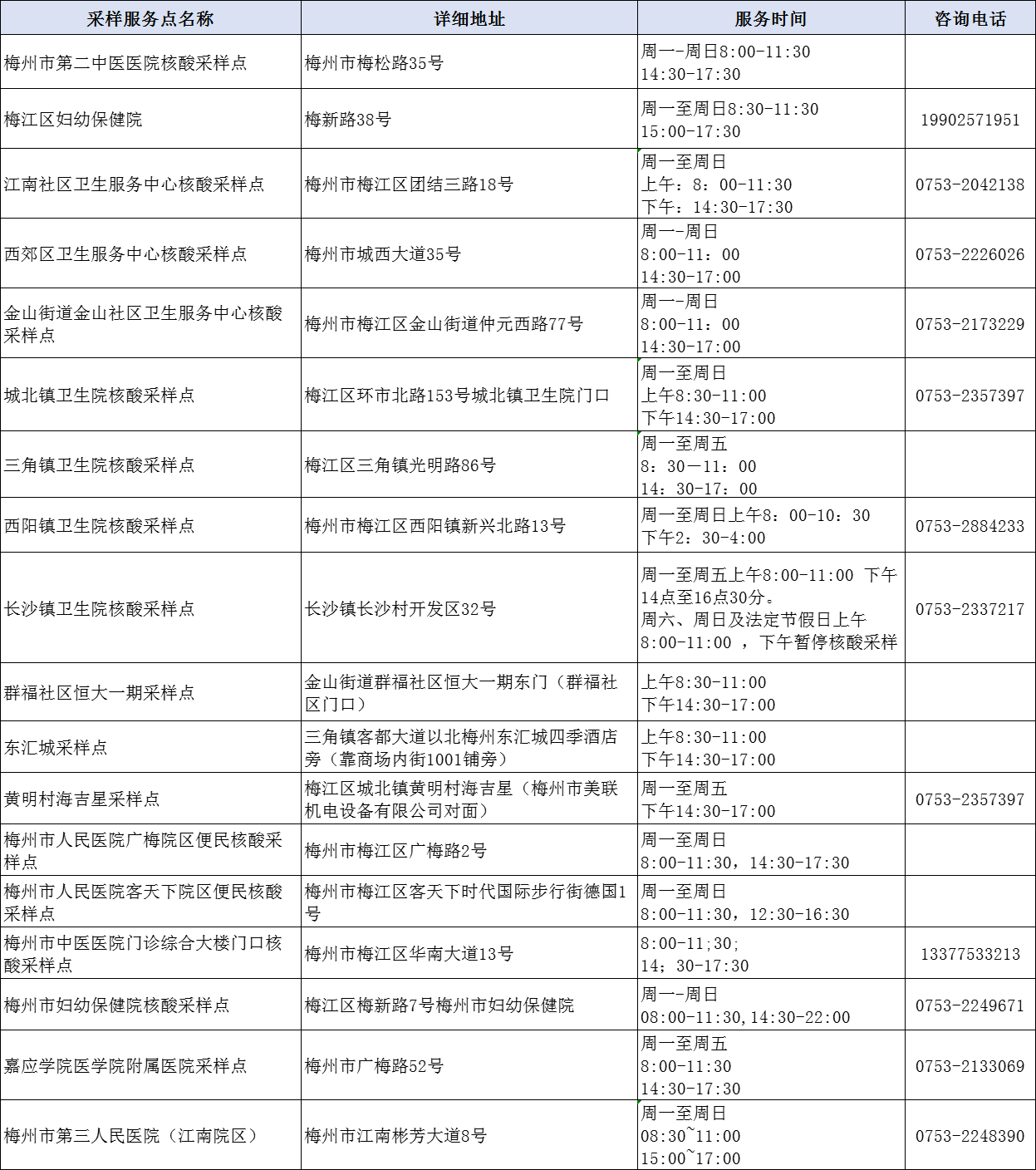 掌上梅州讯 1月18日,我市公布159个“愿检尽检”便民核酸采样服务点,其中梅州市人民医院广梅院区便民核酸采样点、梅州市人民医院客天下院区便民核酸采样点、 梅州市中医医院门诊综合大楼门口核酸采样点可出具英文新冠病毒核酸检测报告。
