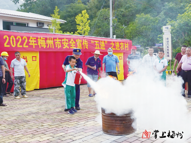 梅州市安全宣传进农村活动吸引了众多居民参与,不少群众还亲自上手学习使用干粉灭火器灭火。(市应急管理局供图)