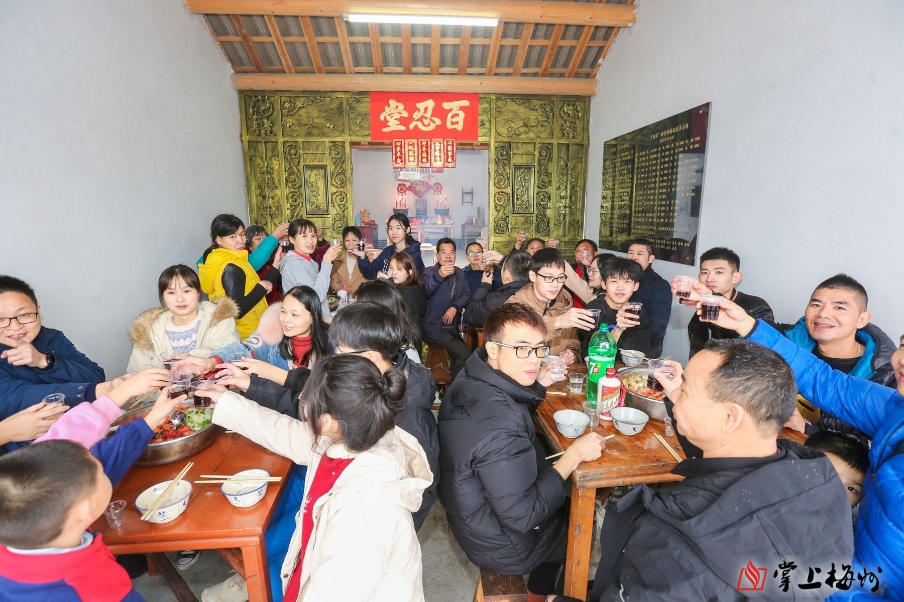 留梅过年的广东富荣粤东云山谷董事长、香港乡贤张展文与家人亲戚在老屋内吃年夜饭,共贺新春佳节。