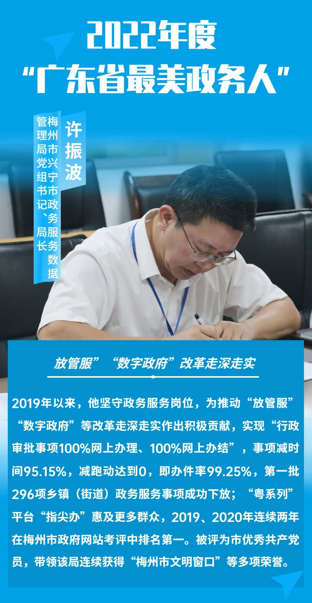 据了解,2019年以来,许振波坚守政务服务岗位,为推动“放管服”“数字政府”等改革走深走实作出积极贡献,实现“行政审批100%网上办理、100%网上办结”,事项减时间95.15%,减跑动达到0,即办件率99.25%,第一批296项乡镇(街道)政务服务事项成功下放;“粤系列”平台“指尖办”惠及更多群众,2019、2020年连续两年在梅州市政府网站考评中排名第一。被评为市优秀共产党员,带领该局连续获得“梅州市文明窗口”等多项荣誉。