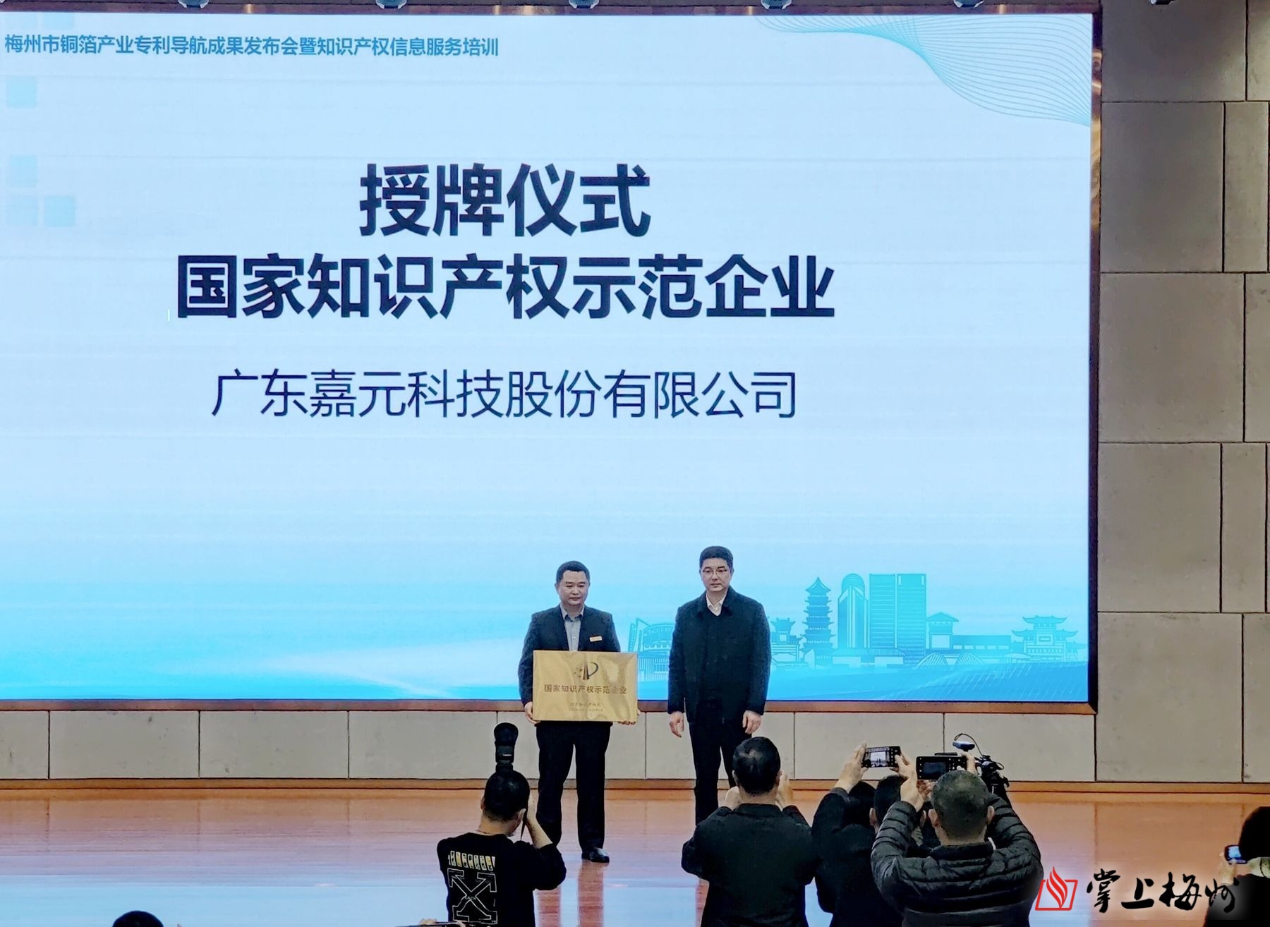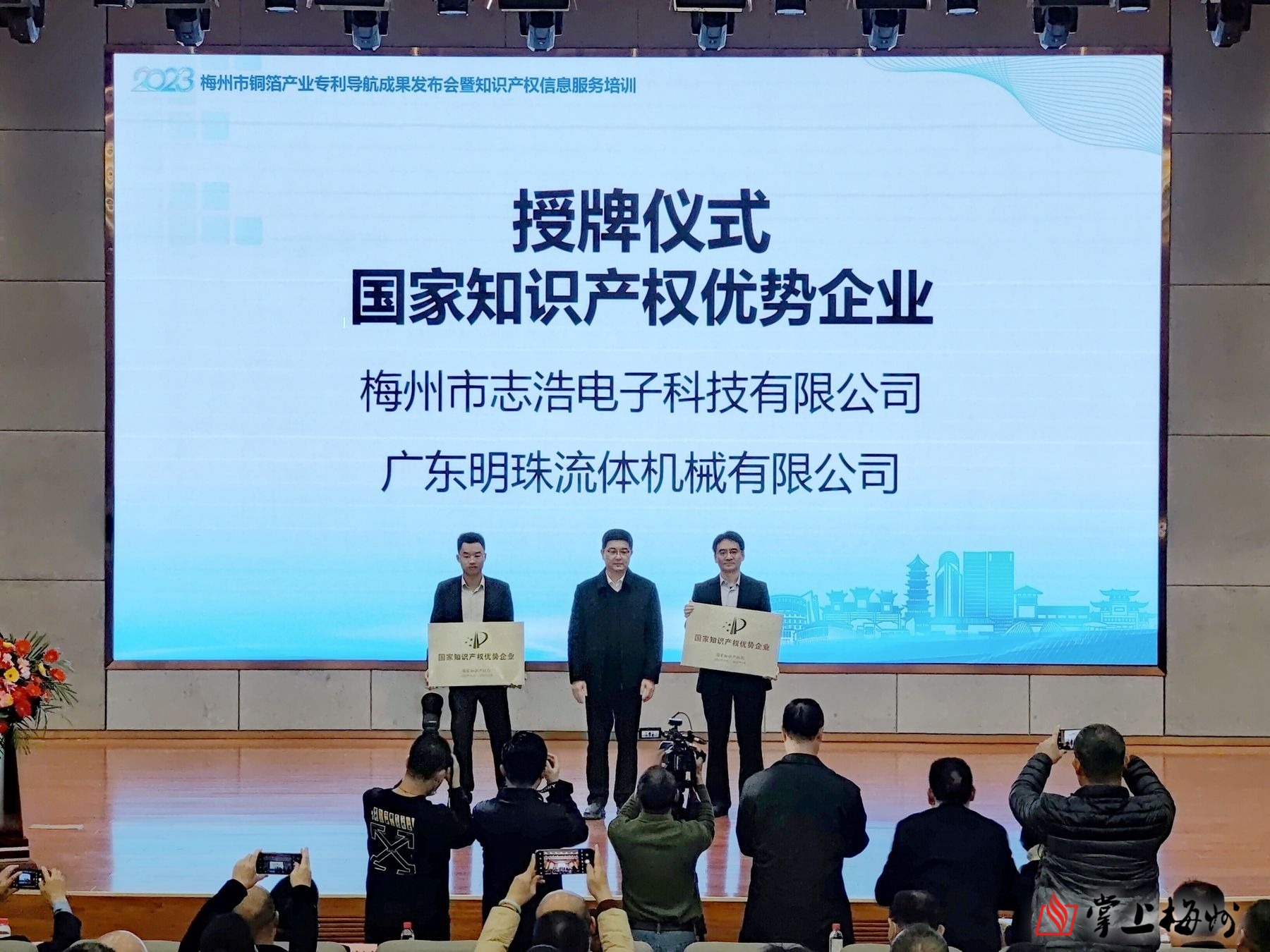 现场为2022年获评国家知识产权优势企业的梅州市志浩电子科技有限公司、广东明珠流体机械有限公司,获评国家知识产权示范企业的广东嘉元科技股份有限公司进行授牌;并发布《梅州市铜箔产业专利导航研究报告》。