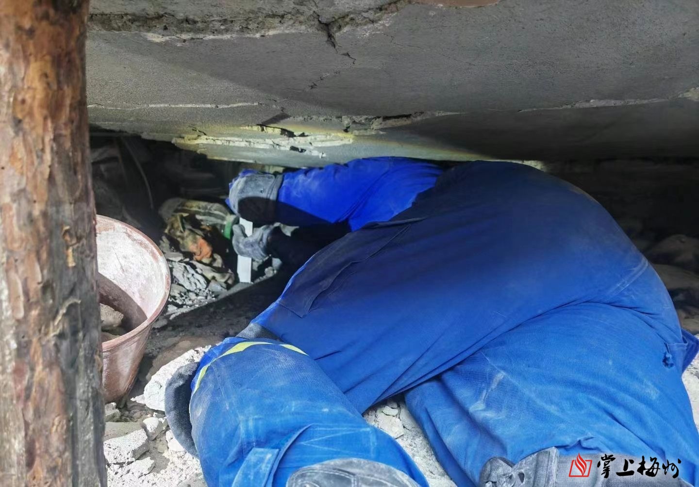古立新与队友在废墟上搜救。