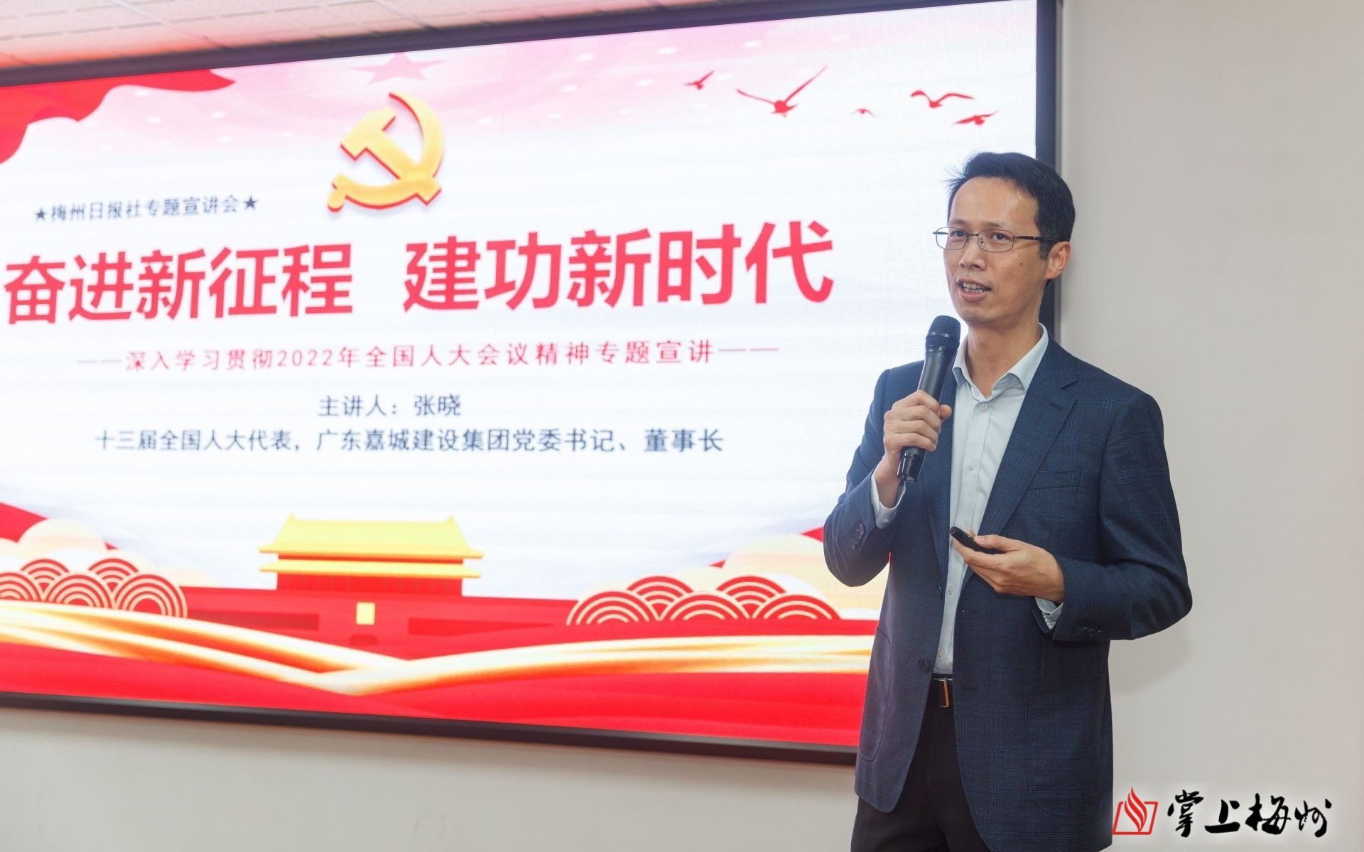 2022年3月25日,张晓到梅州日报社宣讲全国两会精神。(林翔 摄)