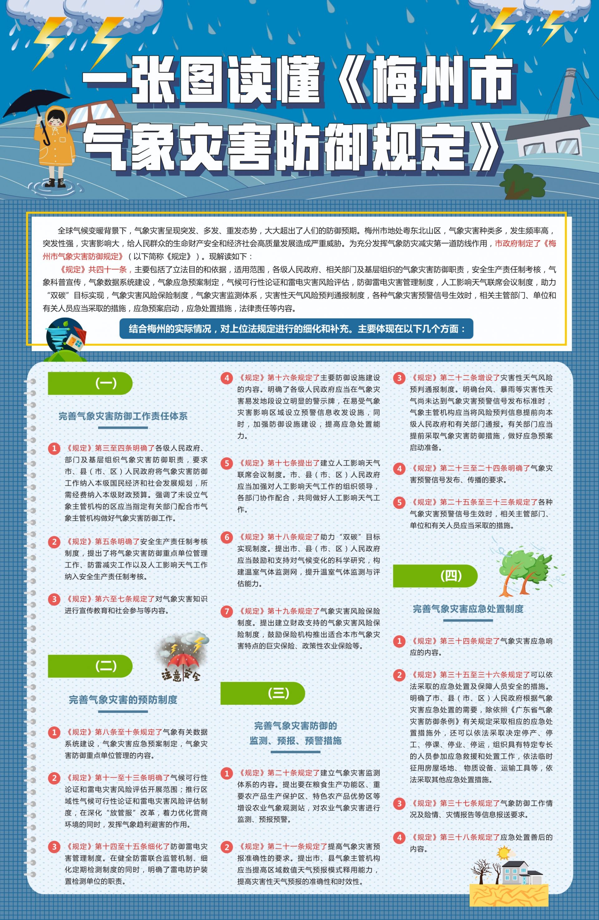 《规定》共6章41条,适用于本市行政区域内的气象灾害防御活动,其所称气象灾害,是指台风、大风、龙卷风、暴雨、高温、干旱、雷电、大雾、灰霾、寒冷、道路结冰和冰雹等所造成的灾害。从气象灾害的预防、监测、预报和预警、应急处置等环节出发,针对不同的气象灾害规定了专门、具体的措施,并明确规定了各级人民政府、气象主管机构、应急管理部门、有关部门和单位、有关组织和个人在气象灾害防御工作中的权利义务。《规定》还明确,要在粮食生产功能区、重要农产品生产保护区、特色农产品优势区等增设农业气象观测站,对农业气象灾害进行监测、预报预警;要建立财政支持的气象灾害风险保险制度,鼓励保险机构推出适合本市气象灾害特点的巨灾保险、政策性农业保险等;要构建温室气体监测网,提升温室气体监测与评估能力,助力“双碳”目标实现。