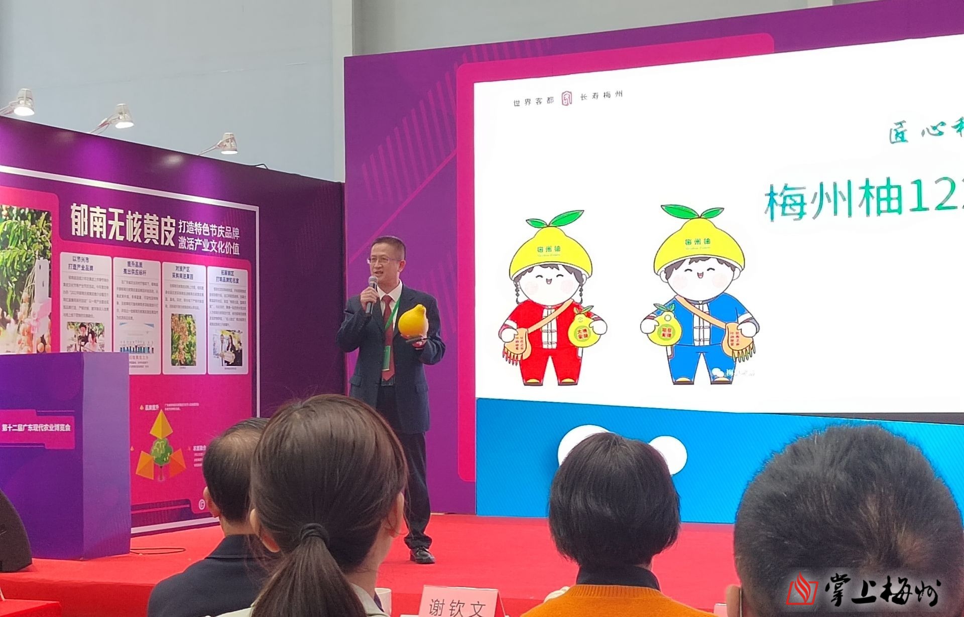 市农业农村局副局长陈爱东现场推介梅州柚。