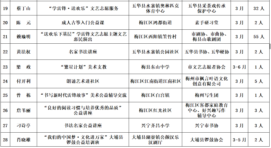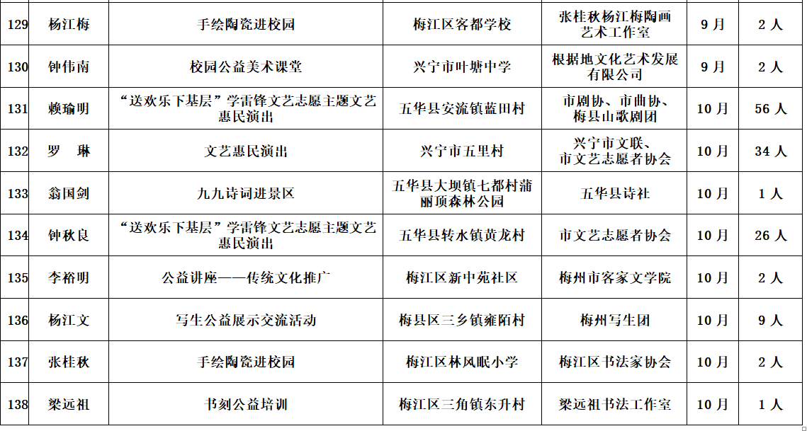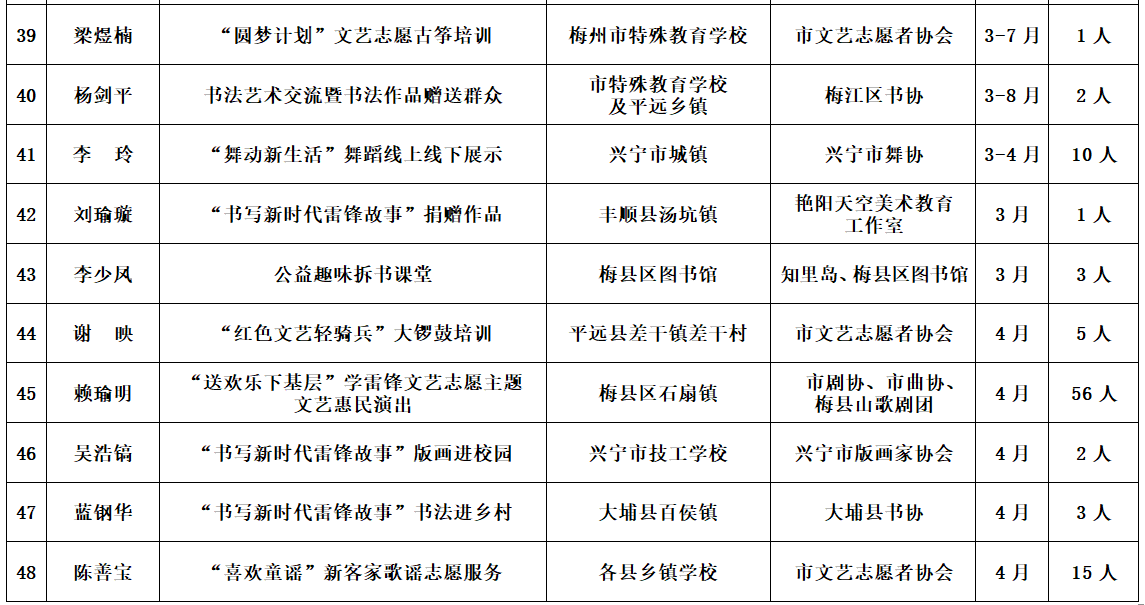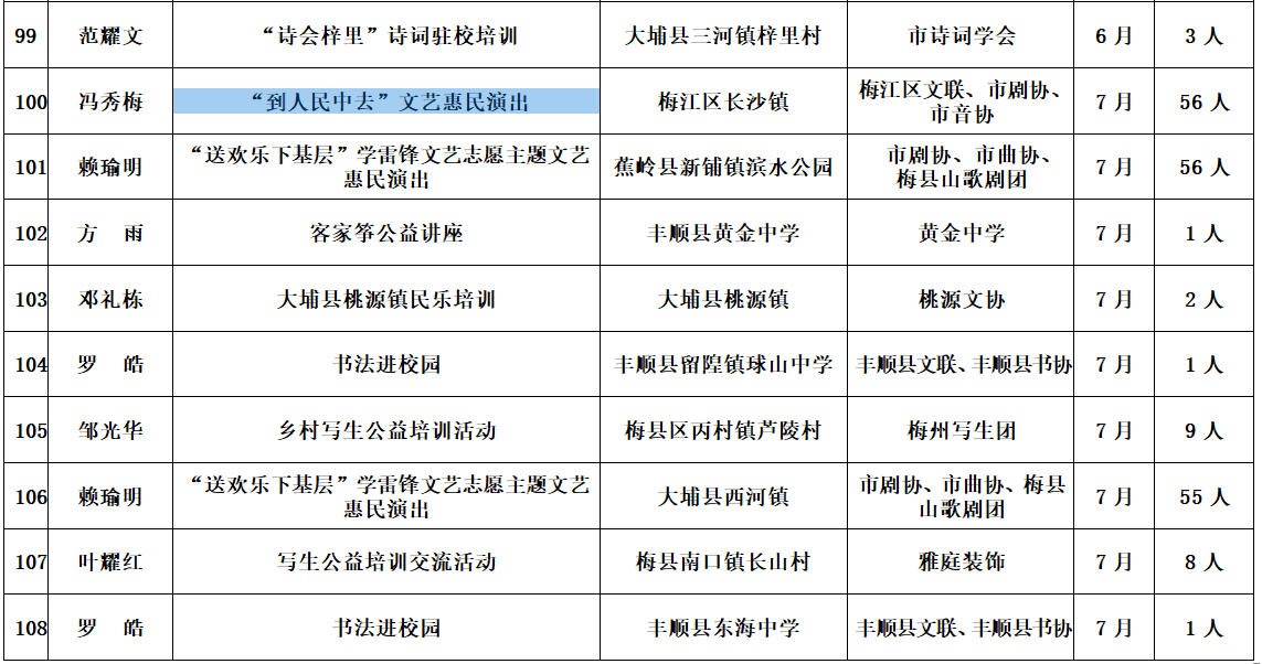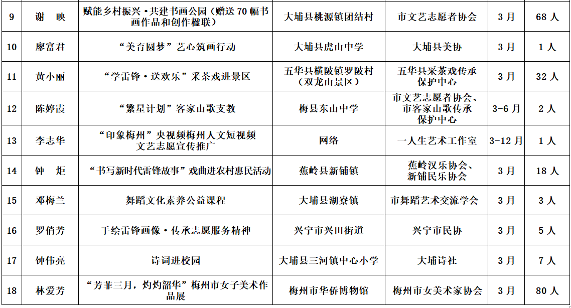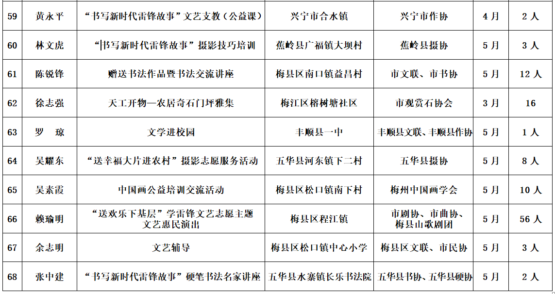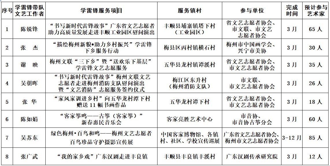 书写新时代雷锋故事——梅州市“艺心联百村”千名文艺志愿者学雷锋下乡服务项目汇总表