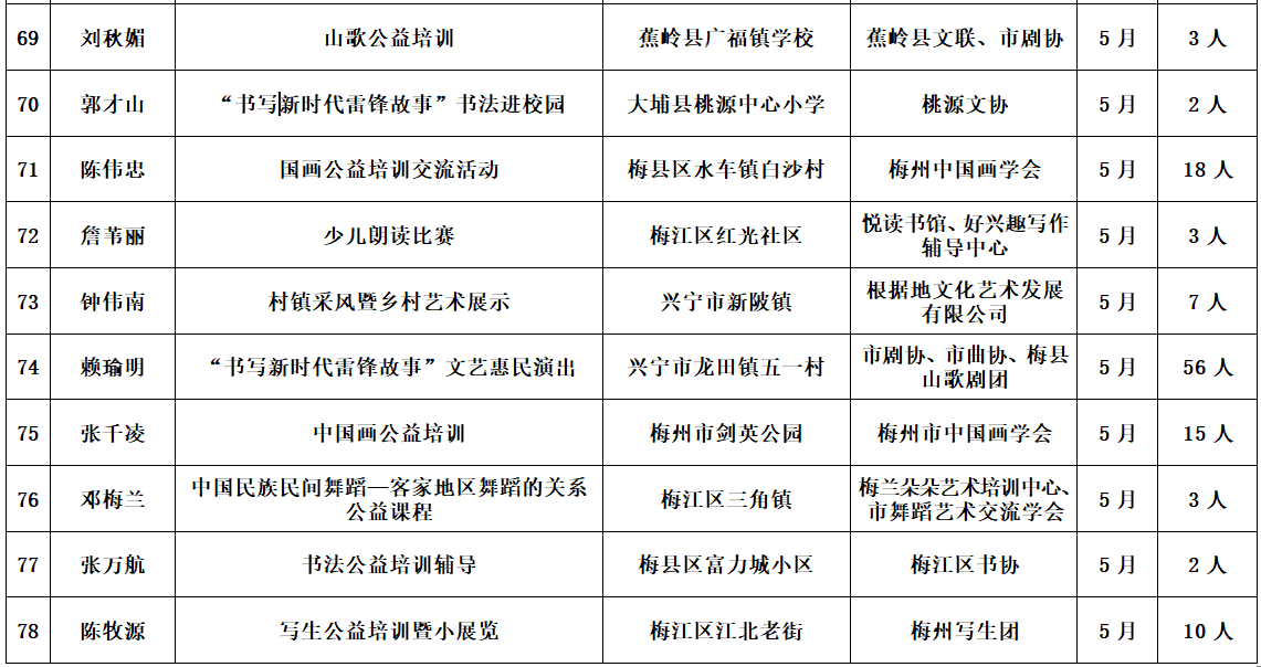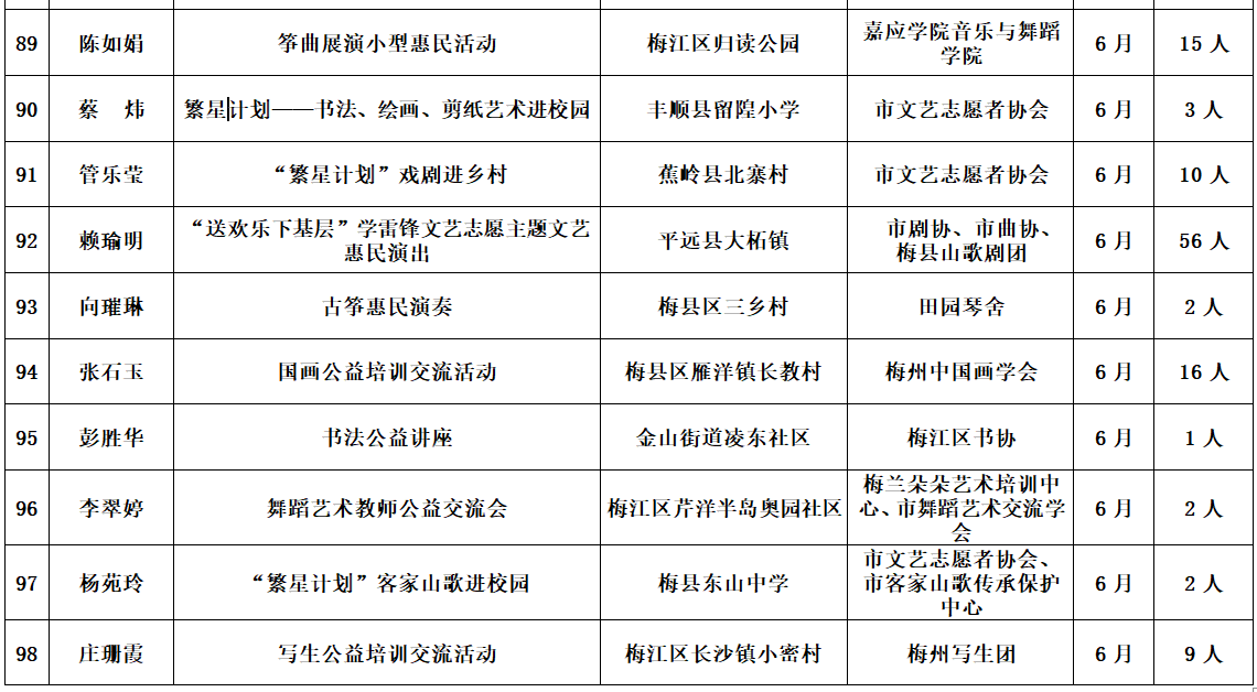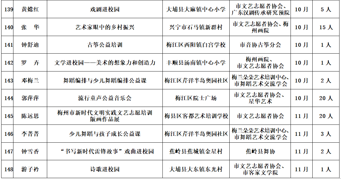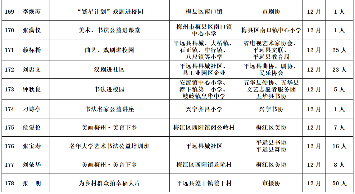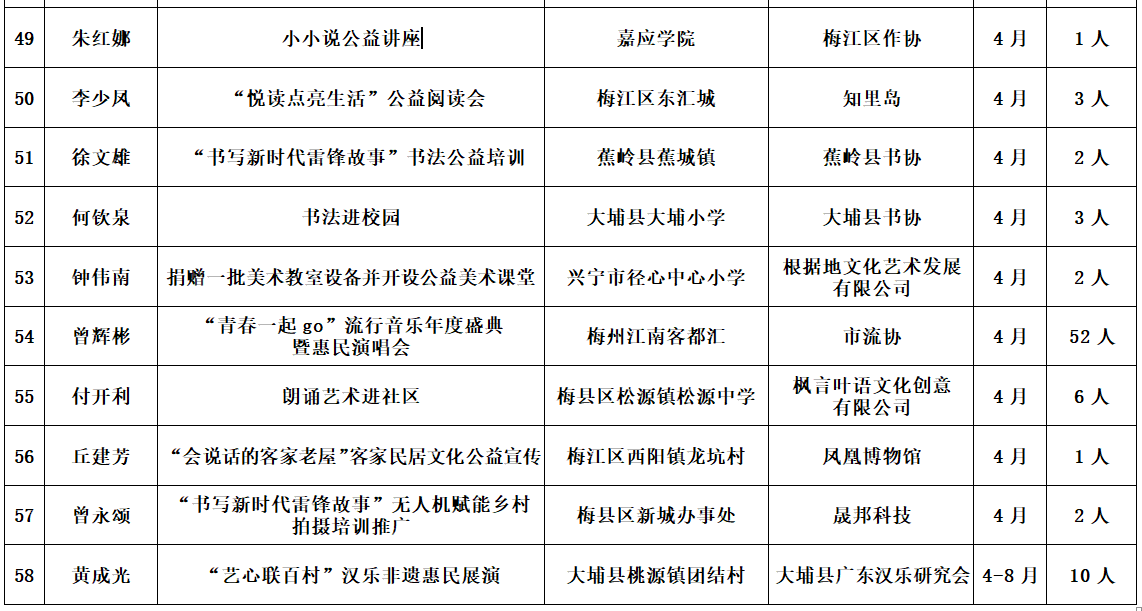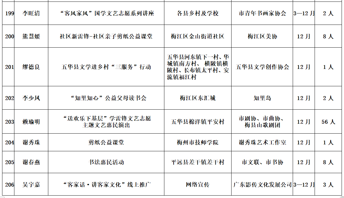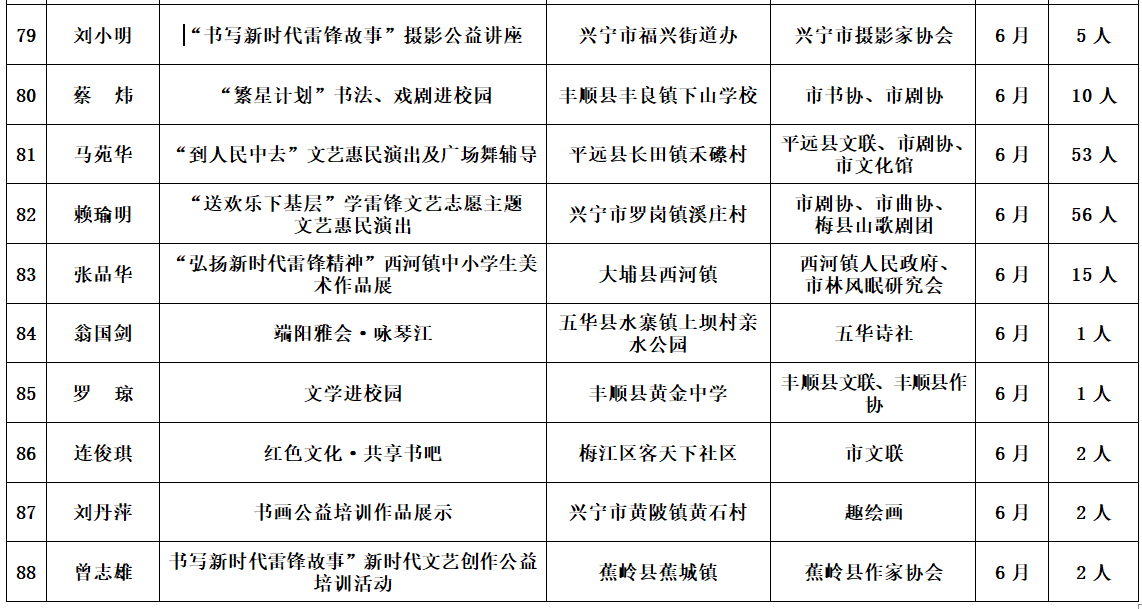 书写新时代雷锋故事——梅州市“艺心联百村”千名文艺志愿者学雷锋下乡服务项目汇总表