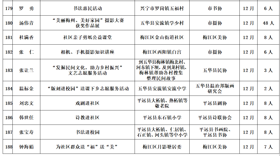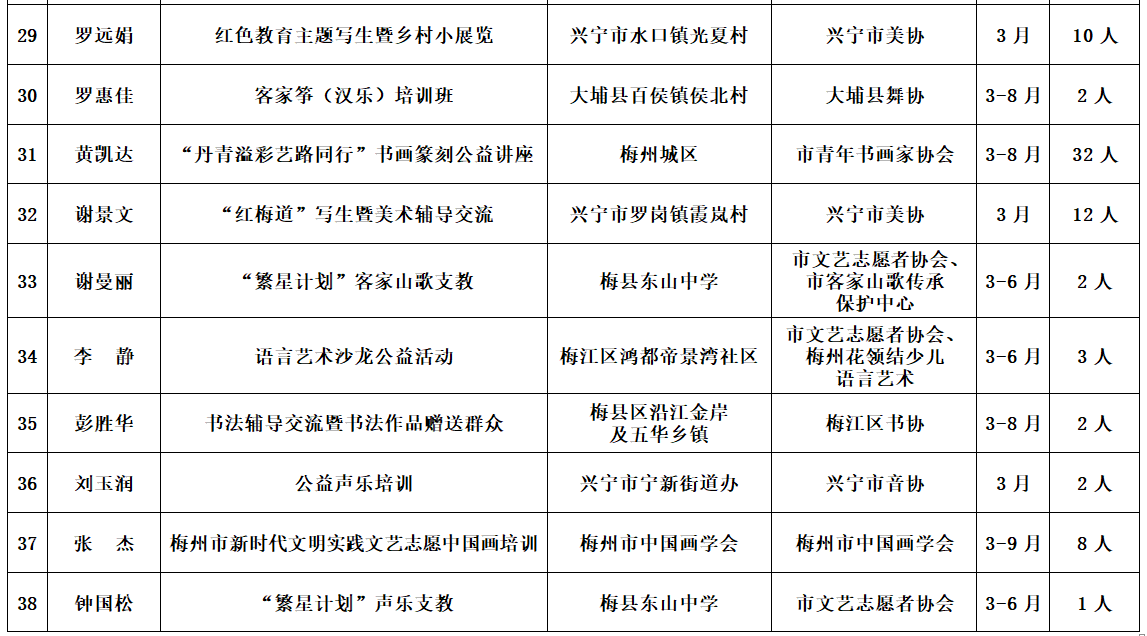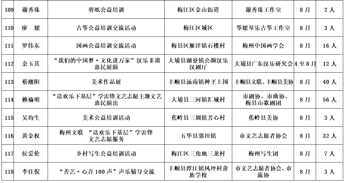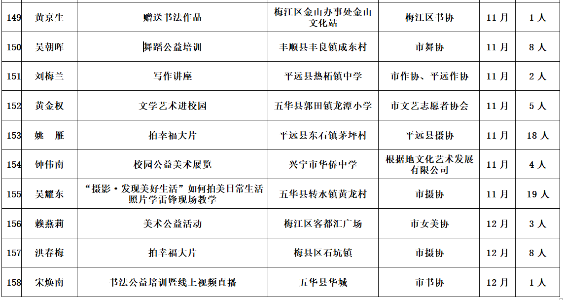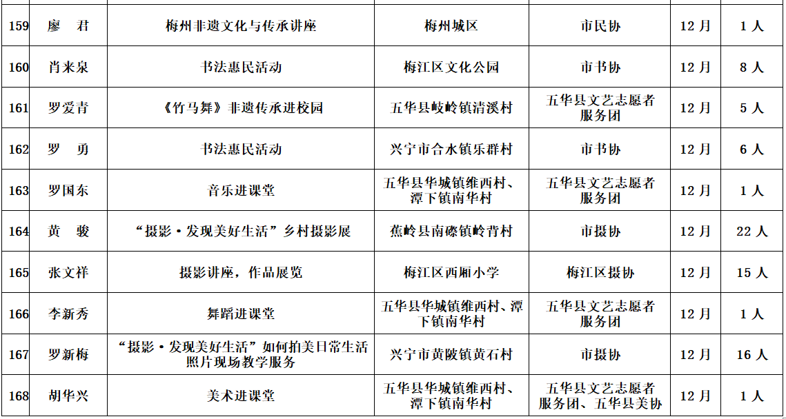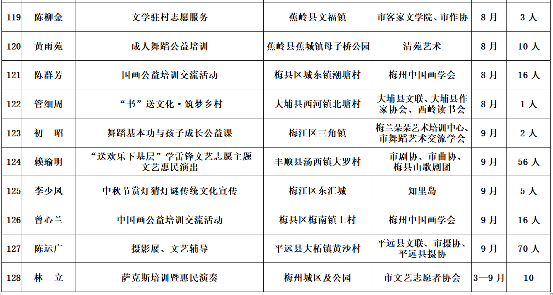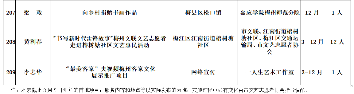 书写新时代雷锋故事——梅州市“艺心联百村”千名文艺志愿者学雷锋下乡服务项目汇总表
