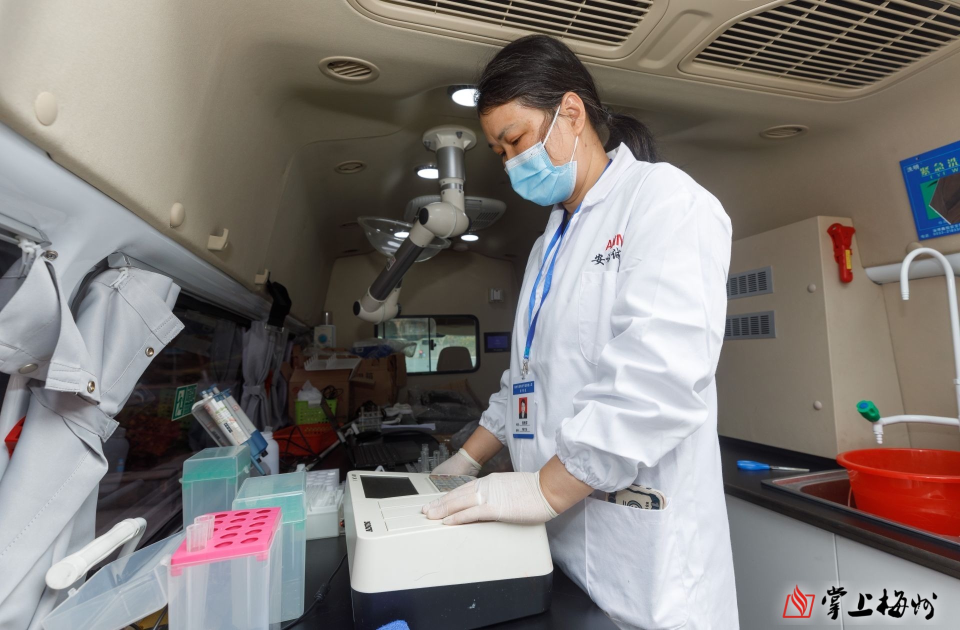 食品快速检验车开进活动现场,工作人员为群众检测农产品的农药残留情况。