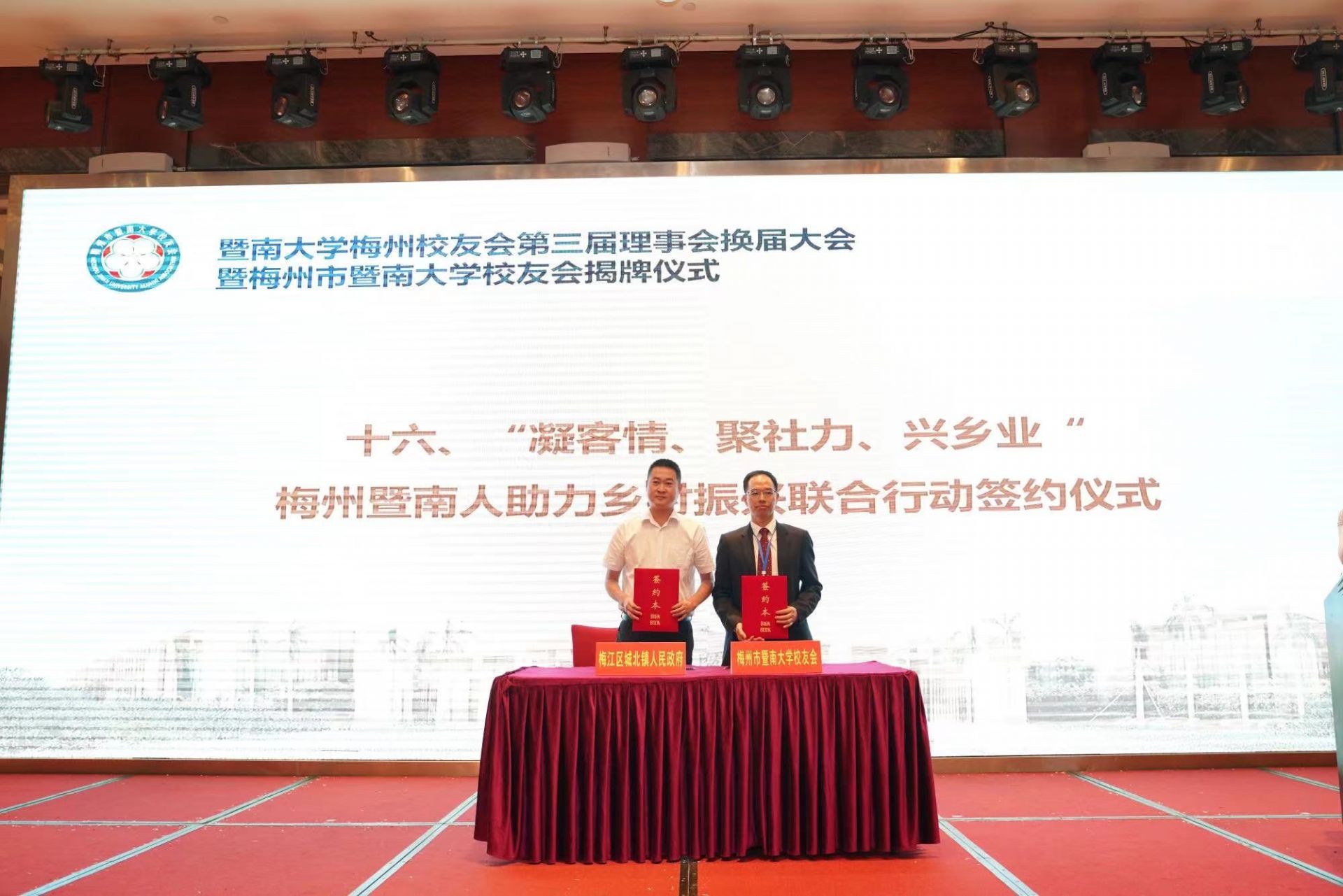 活动中,梅州市暨南大学校友会与梅江区城北镇人民政府签约,共同开展“凝客情、融湾区、兴乡业”梅州暨南人助力乡村振兴联合行动。梅州市暨南大学校友会将做好 “6•30”资金筹集工作,募集暨南大学乡村振兴帮扶专项基金参与开展城北镇公益帮扶,组织梅州暨南人利用寒暑假期返乡开展支教助学、关爱老人和留守儿童等社会实践活动,并联动在梅医疗界校友,联合暨南大学附属第一医院驻五华医疗帮扶工作队,定期在城北镇卫生院开展义诊活动。